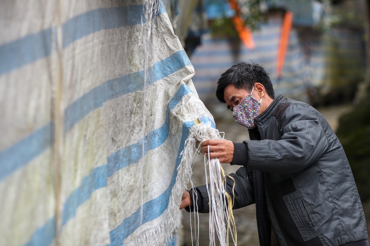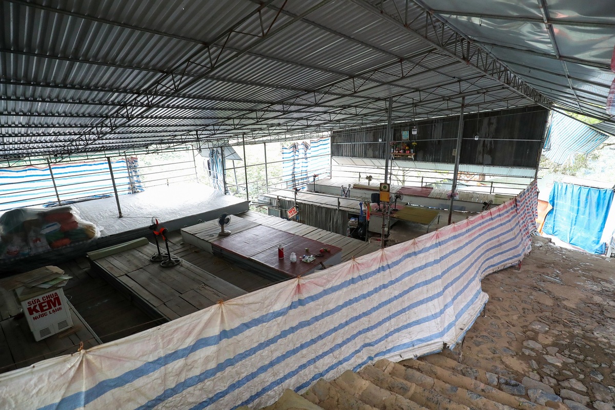 Trên đường dẫn lên động Hương Tích, ông Trần Xuân Thuỷ (53 tuổi, thôn Yến Vỹ) lúi húi giăng tấm bạt để che đậy hàng quán bên trong. Trước đó, gia đình ông Thuỷ đầu tư cả trăm triệu đồng để lấy hàng hoá phục vụ du khách, nhưng nay số hàng này có nguy cơ không thể tiêu thụ.