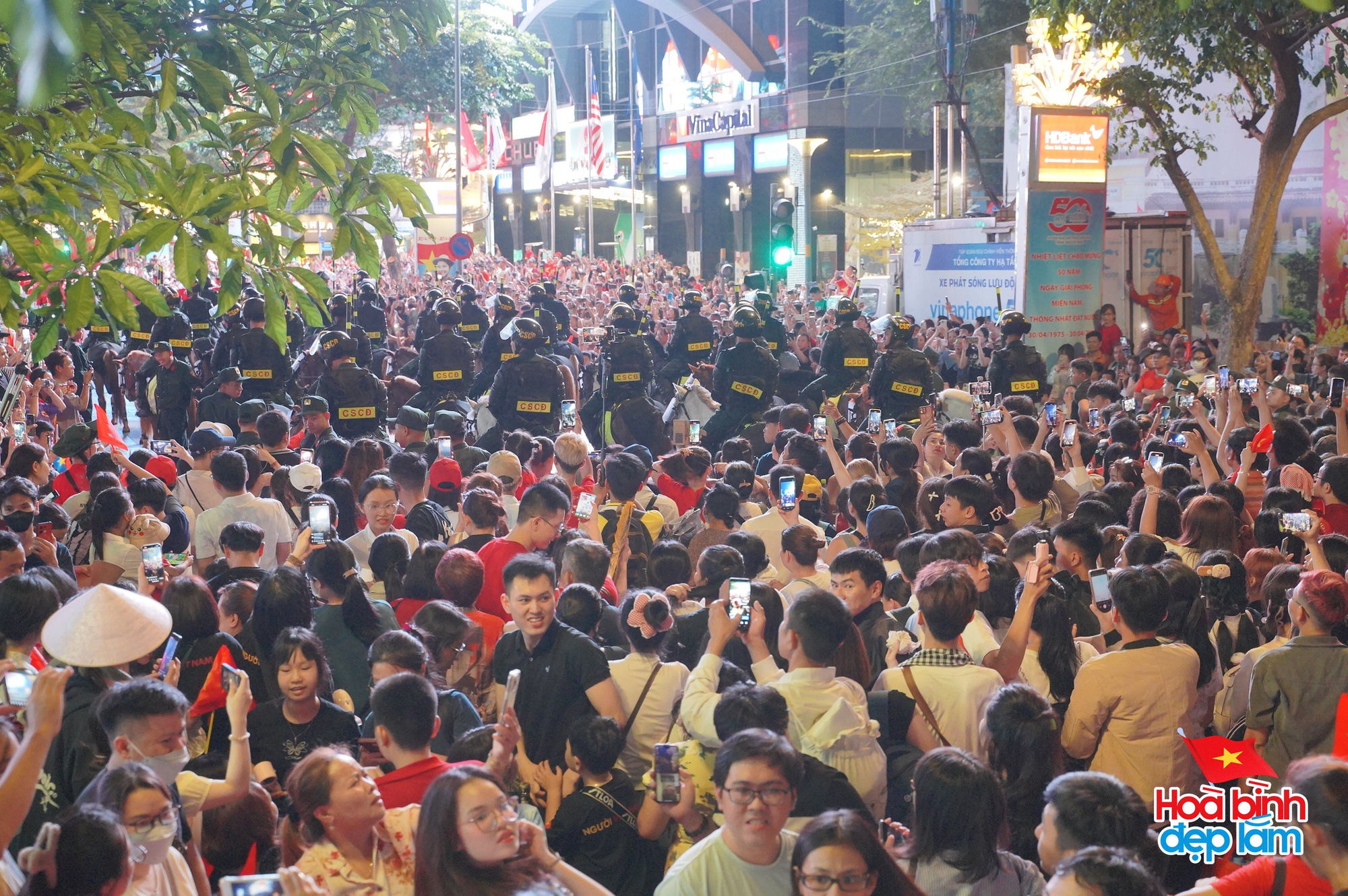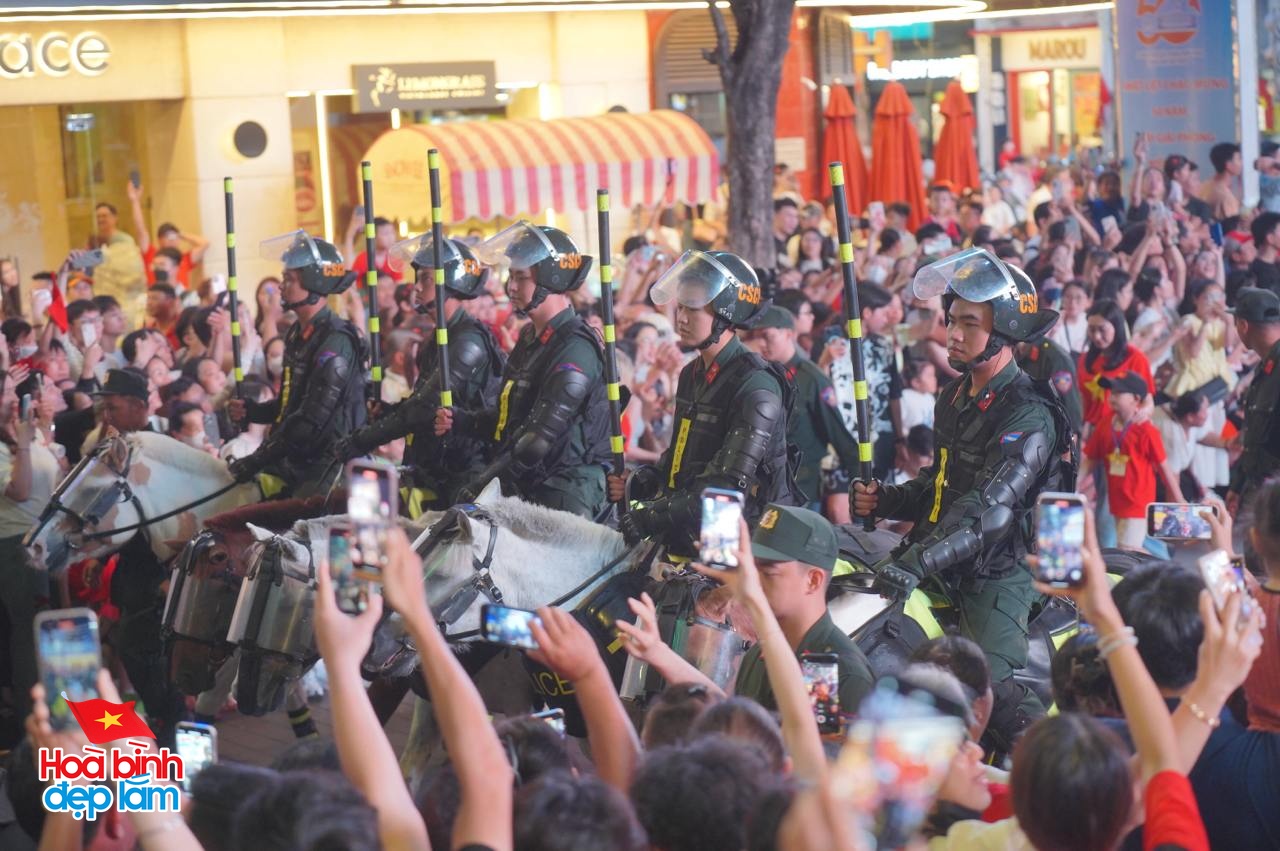Chương trình diễu hành kỵ binh do Bộ Công an tổ chức đã diễn ra trên đường Nguyễn Huệ thu hút đông đảo người dân. Ngay từ sớm, người dân đã kéo tới chật kín đoạn đường.