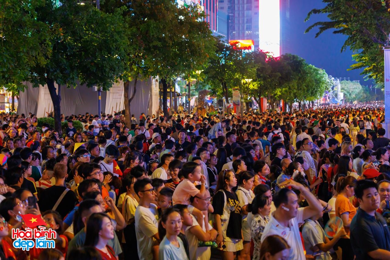 19 giờ 30: Đường Nguyễn Huệ vẫn chật kín người, cờ sao phấp phới