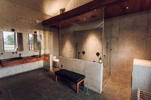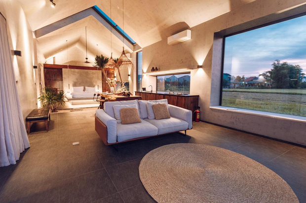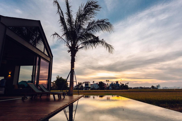 Phía trước phòng khách còn được thiết kế bể bơi "vô cực". Đây là nơi vô cùng tuyệt vời để vừa tận hưởng làn nước mát lành vừa ngắm nhìn cánh đồng lúa xung quanh.