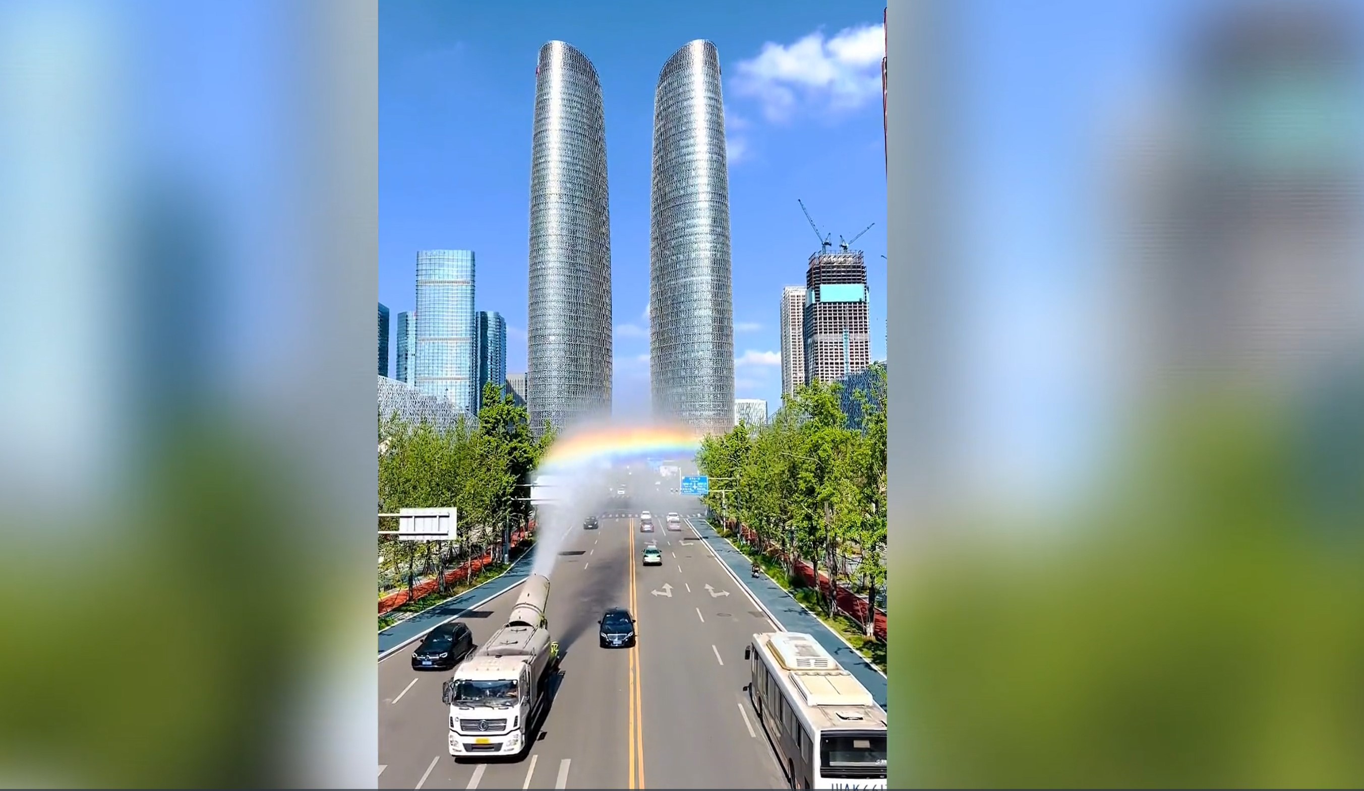 Khi đó số nước dưới dạng sương do chiếc xe phun ra, dưới ánh nắng mặt trời đã vô tình tạo ra một chiếc cầu vồng vô cùng đẹp mắt khiến nhiều người đi đường phải dừng lại để lấy điện thoại ra chụp ảnh và quay phim.