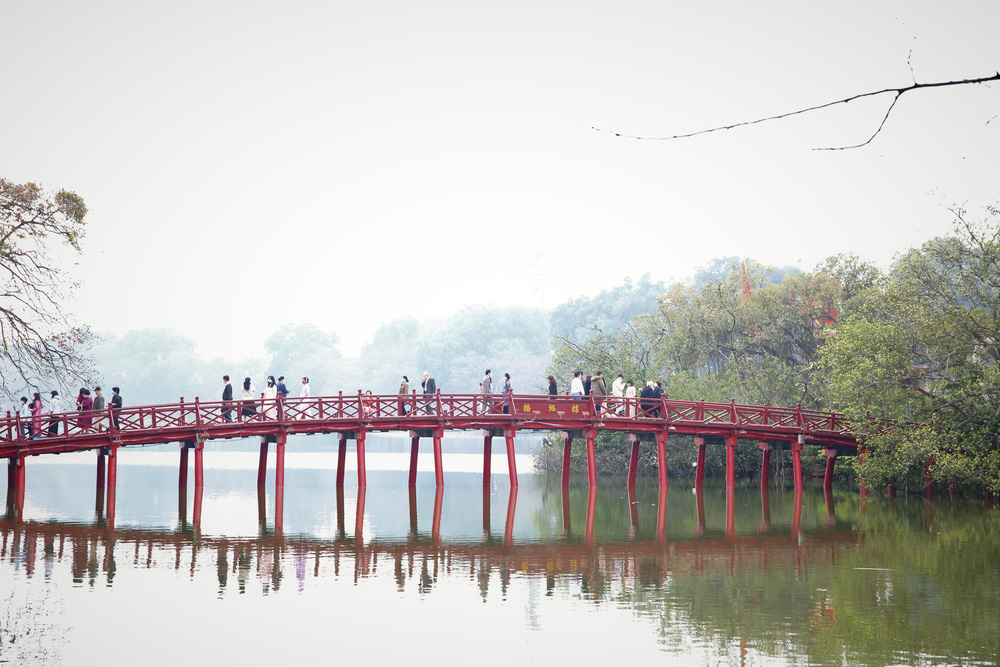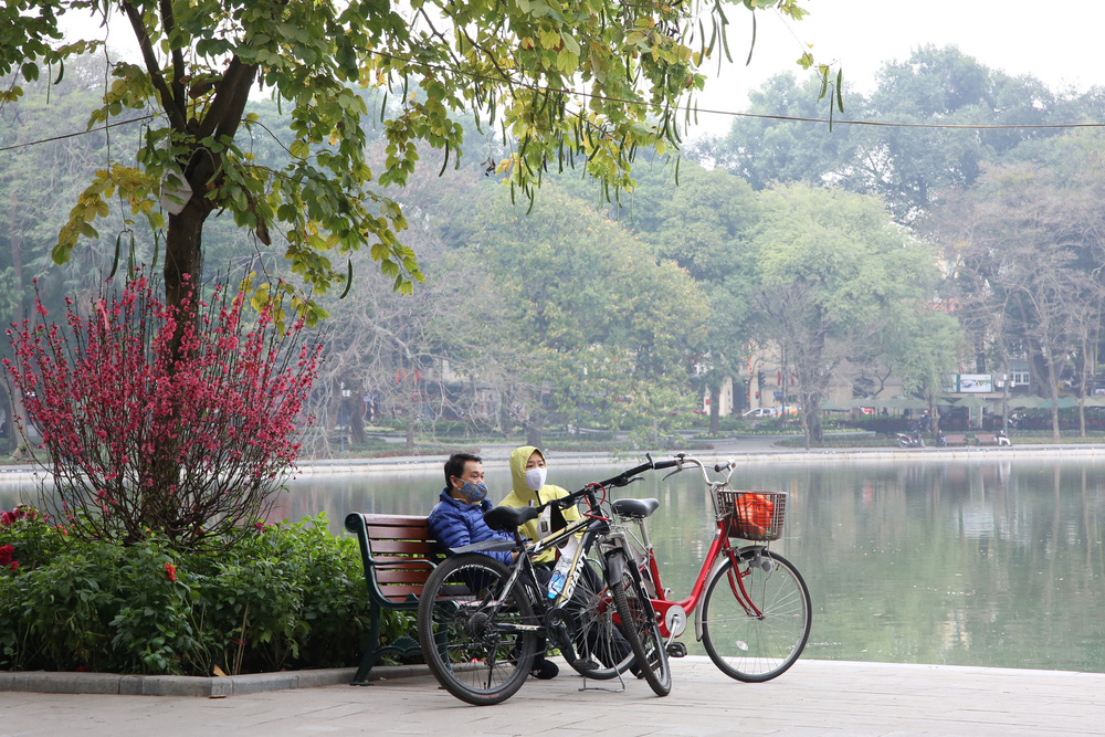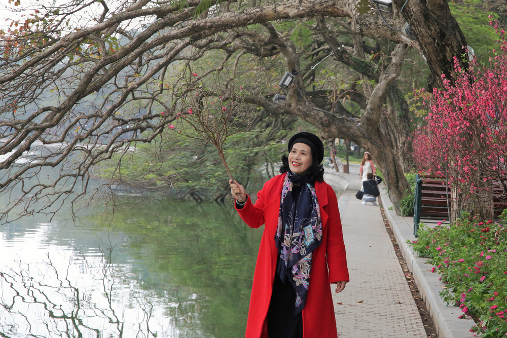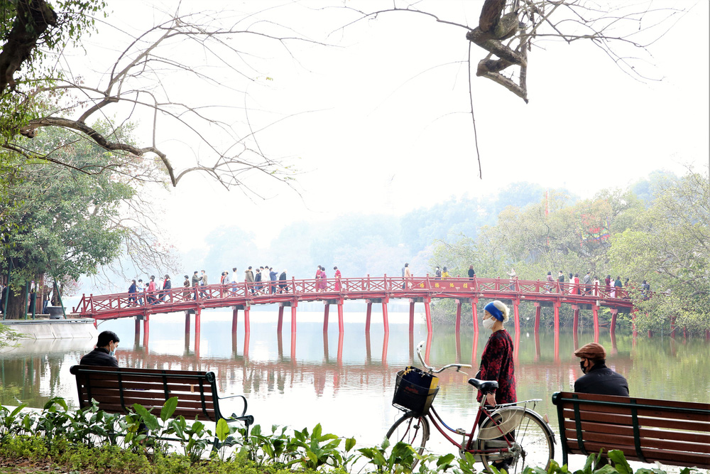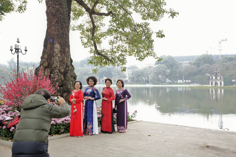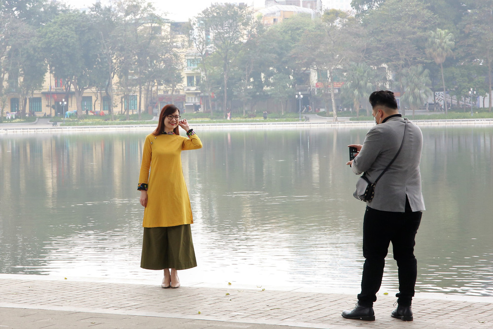 Trong buổi sáng mùng 1 Tết mát mẻ, trong lành, nhiều người dân ở Hà Nội đã đón chào năm mới Tân Sửu bằng cách diện áo dài du xuân Hồ Gươm.