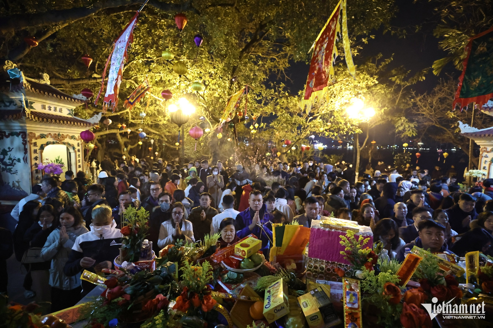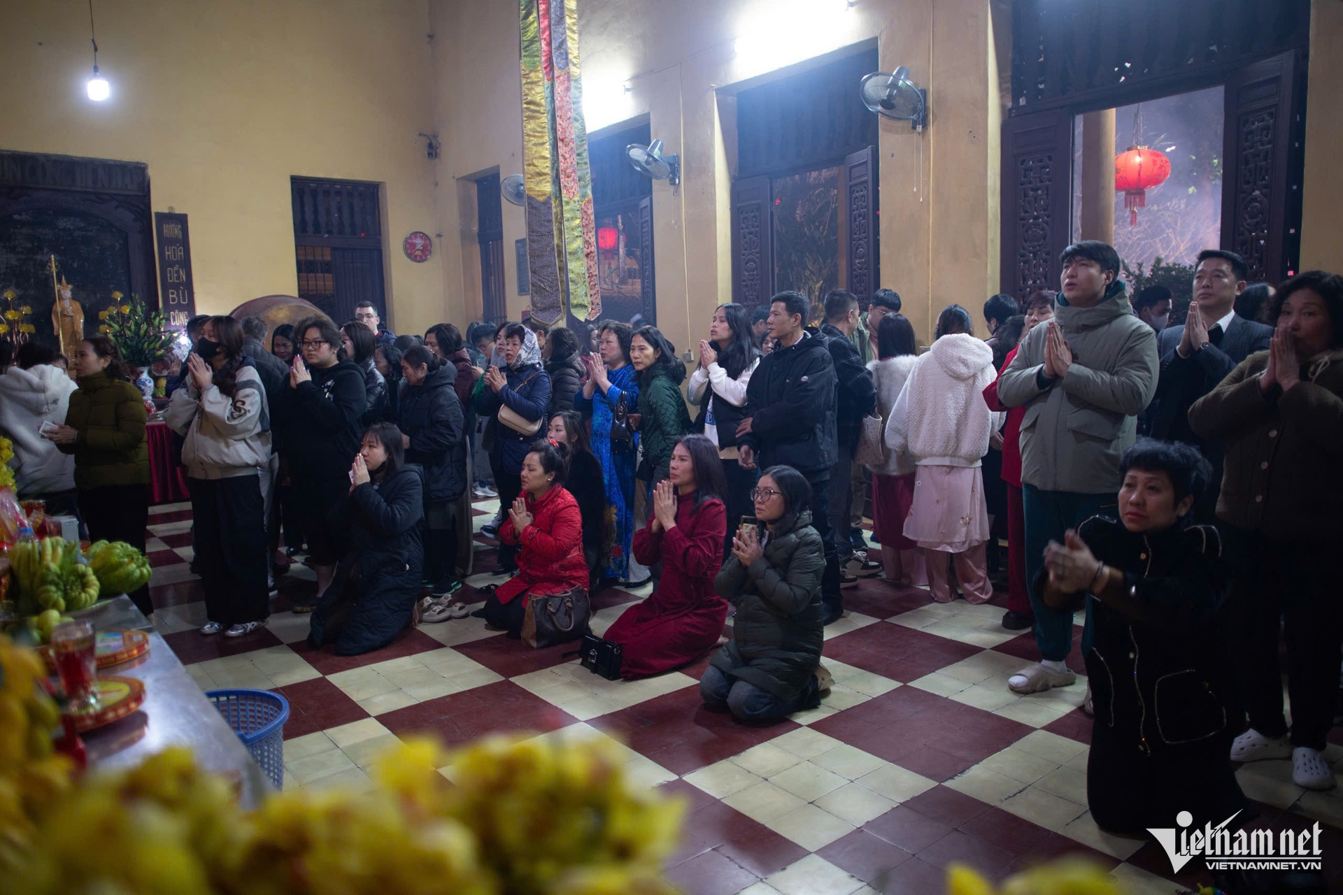 Bên trong sân phủ chật kín người đứng khấn vái. Đồ lễ của bà con đơn giản gồm bánh kẹo, hoa quả và nén hương.