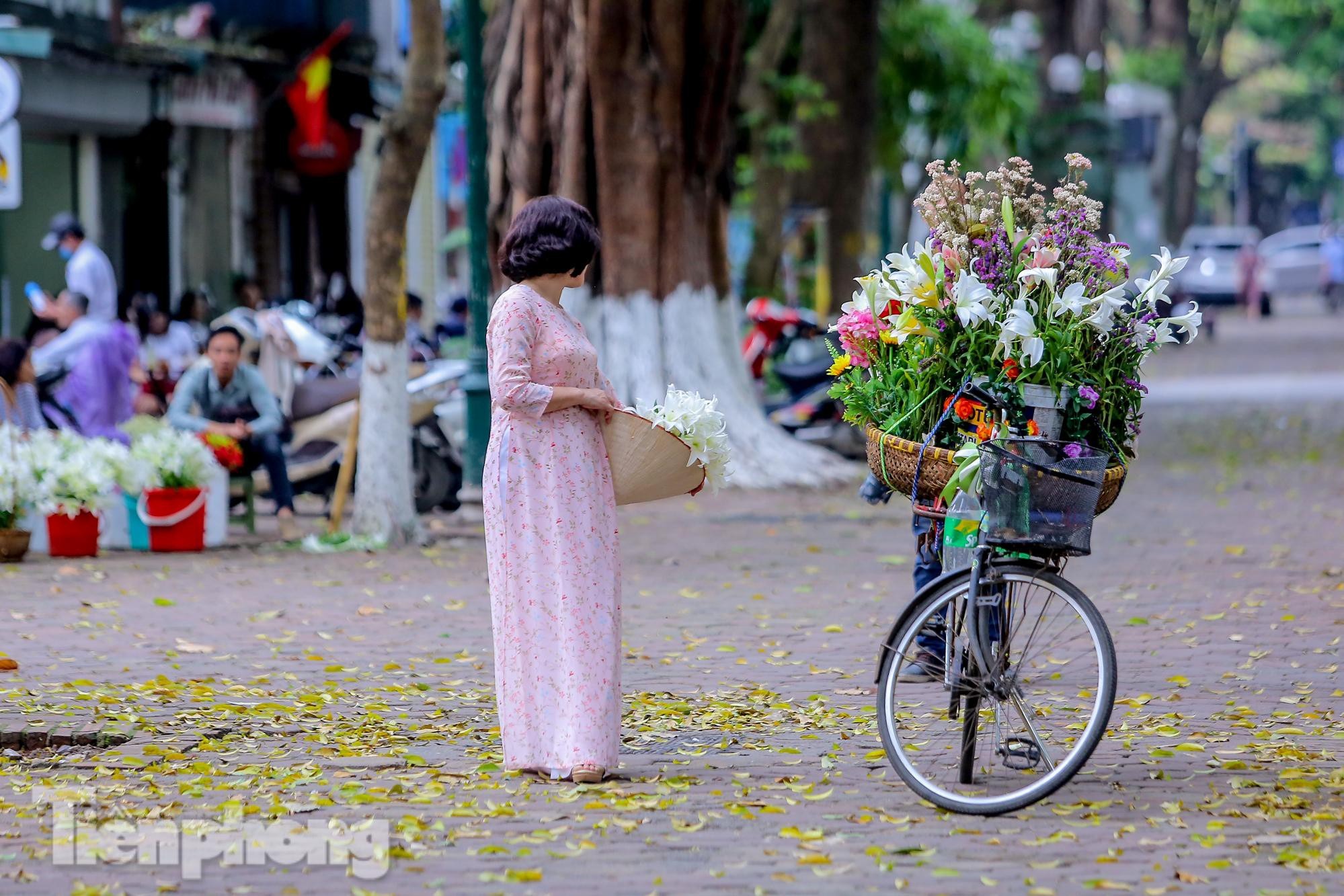 Cùng gánh hoa loa kèn bên góc phố với đám thảm lá sấu vàng dưới chân tạo nên khung cảnh thơ mộng thu hút nhiều người dân Hà thành, mặc dù bận bịu với công việc cũng phải tranh thủ thưởng thức, lưu giữ những tấm hình.