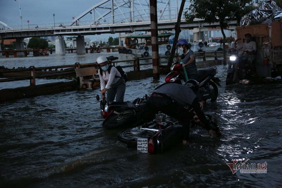 Đường TP.HCM ngập nặng do triều cường vượt báo động động 3 gây khó khăn cho người dân đi làm về nhà, trong đó có một số người bị ngã sõng soài, xe chết máy.