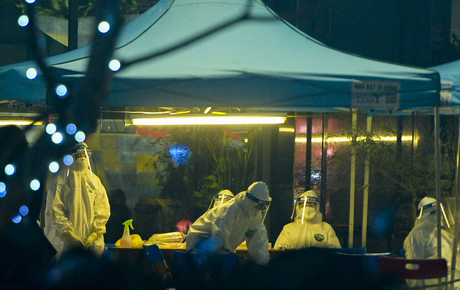 Mặc dù đã sang rạng sáng 5/2 nhưng vẫn có rất đông người dân đến chung cư 88 Láng Hạ để lấy mẫu xét nghiệm COVID-19.
