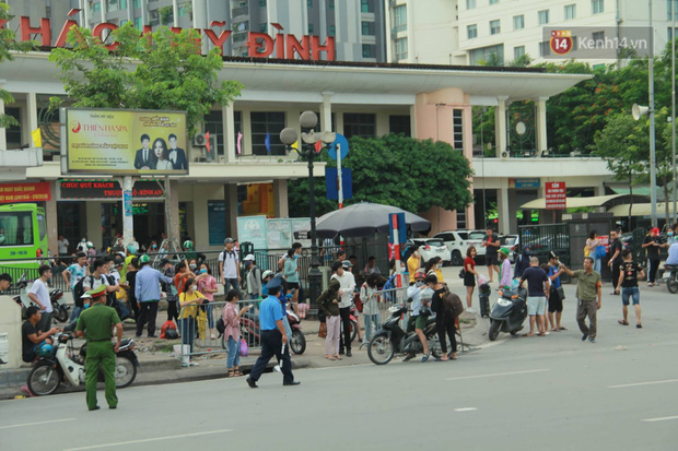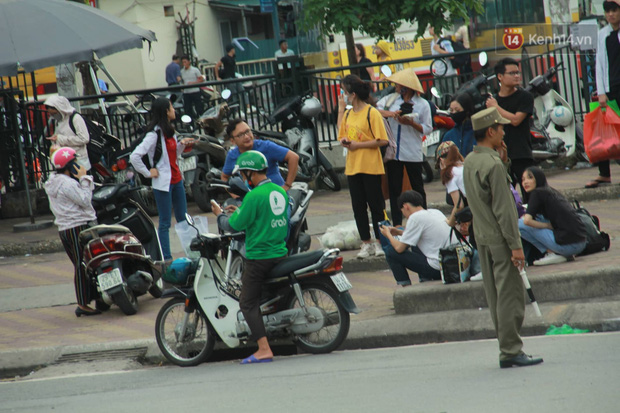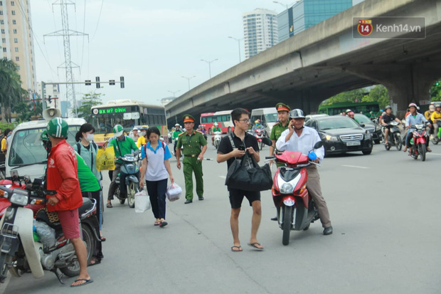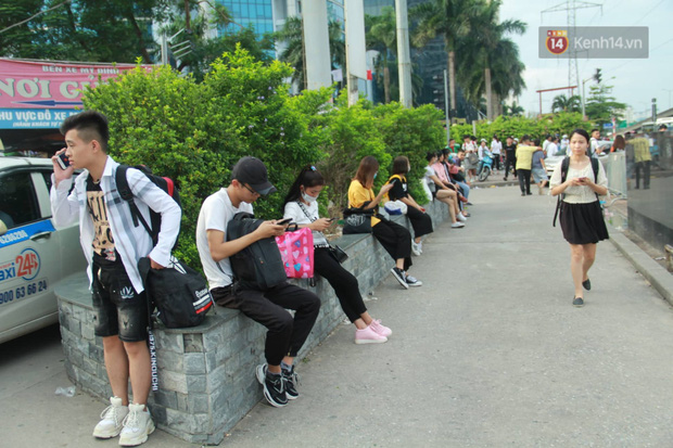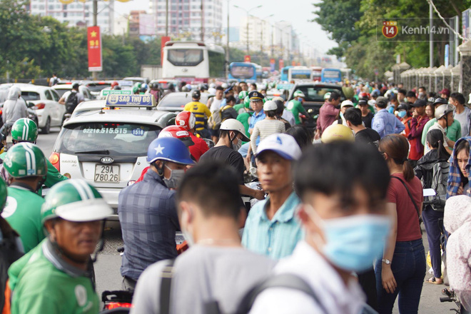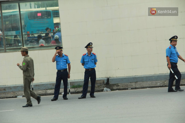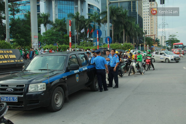Khu vực trước cổng Bến xe Mỹ Đình khá lộn xộn do các phương tiện chen chúc xếp hàng, người dân đổ ra đường bắt taxi, xe ôm khiến lực lượng chức năng rất vất vả duy trì trật tự.
