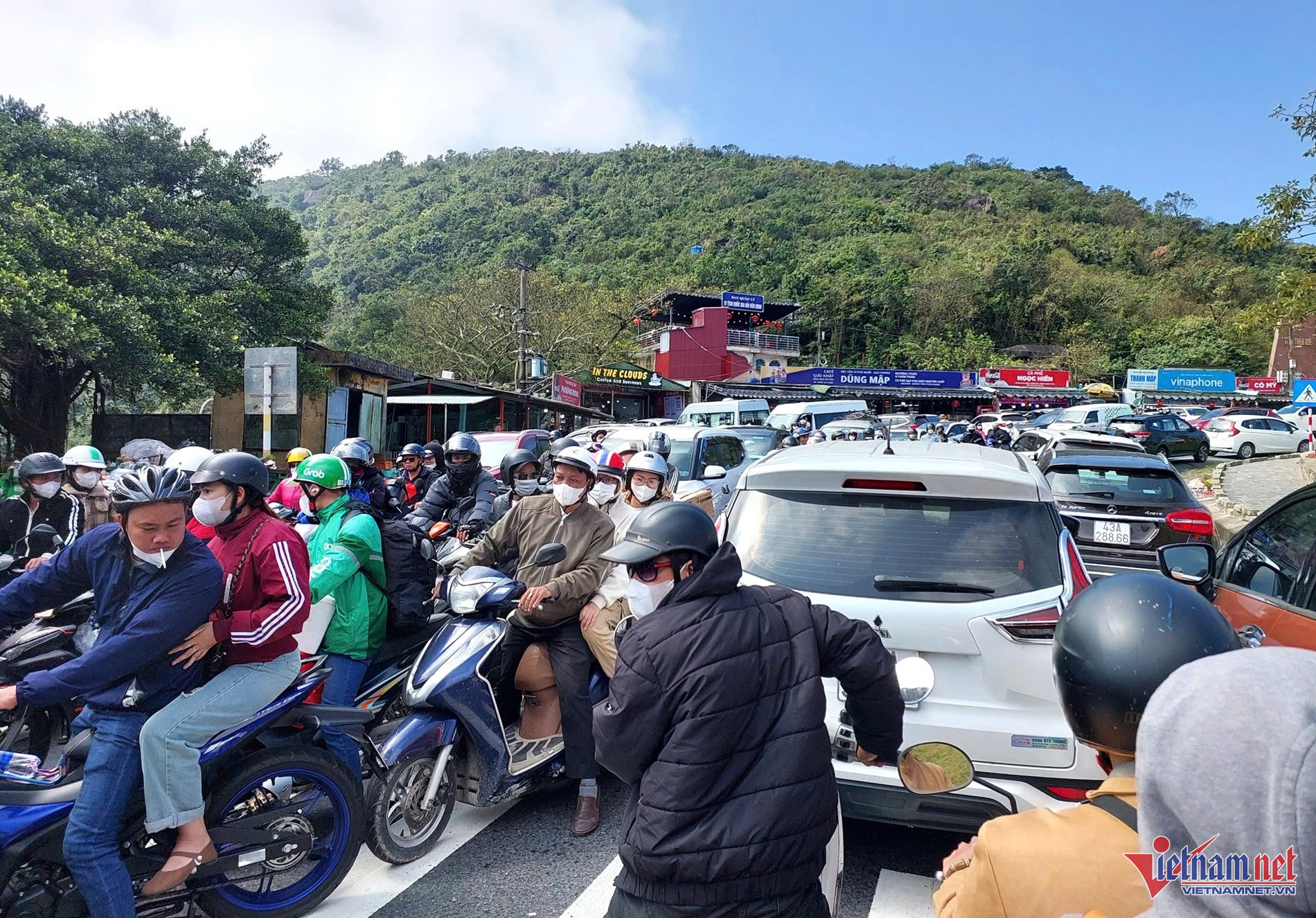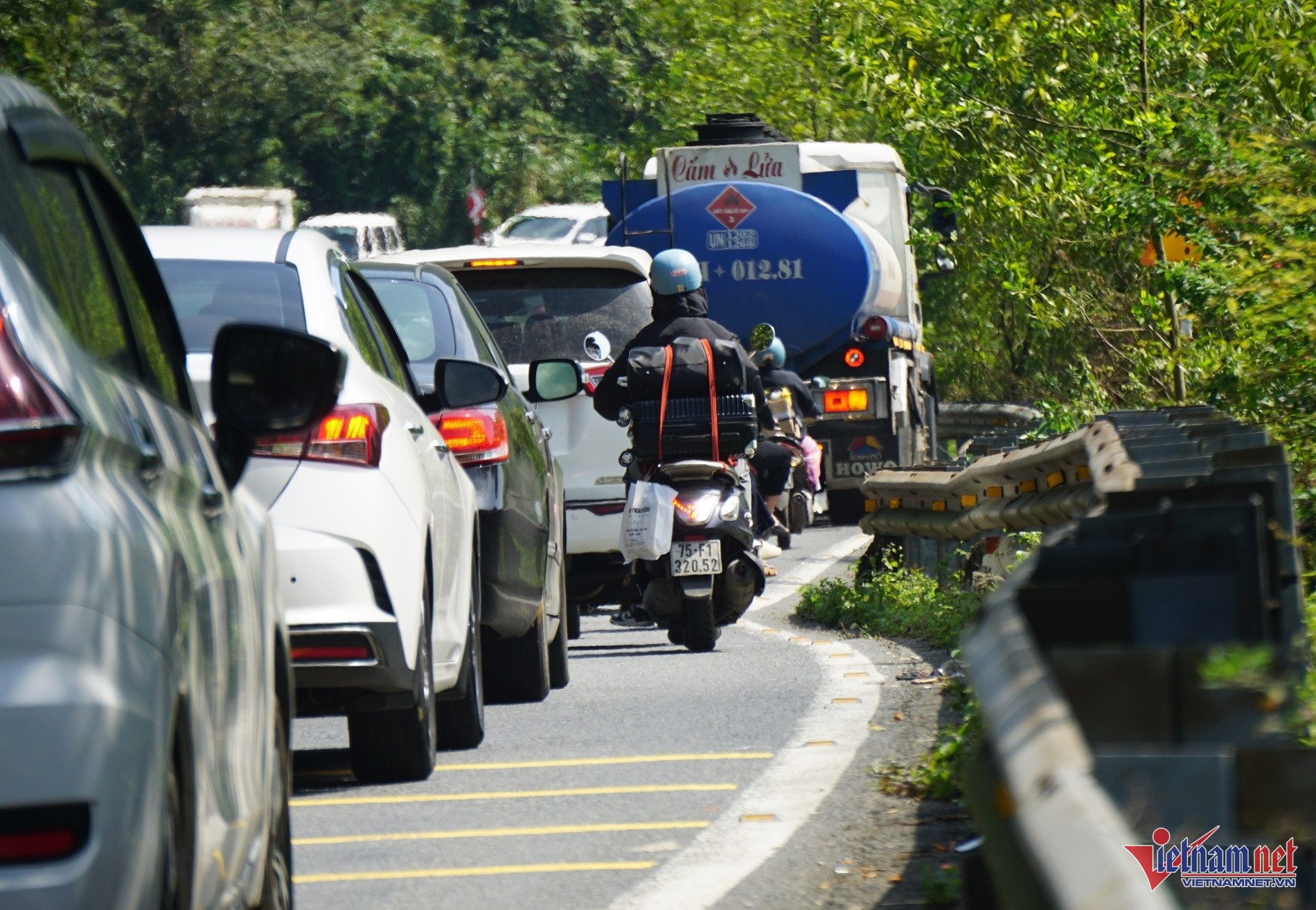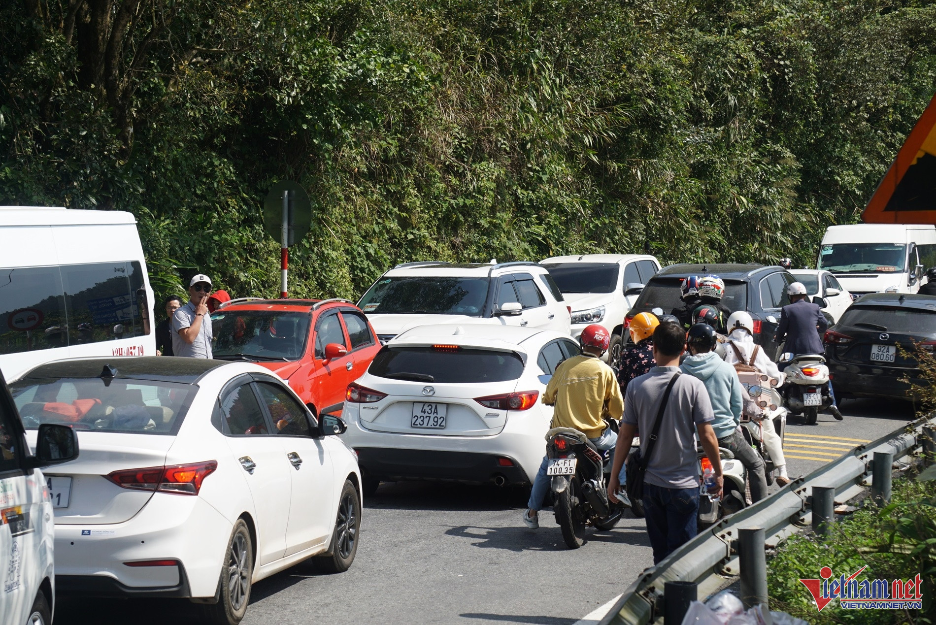 Trưa cùng ngày, khu vực đỉnh đèo Hải Vân kẹt cứng phương tiện. Trước khu vực di tích Hải Vân Quan, ô tô, xe máy nối đuôi nhau, ùn ứ hơn 1km khi lượng phương tiện di chuyển đường đèo quá đông.