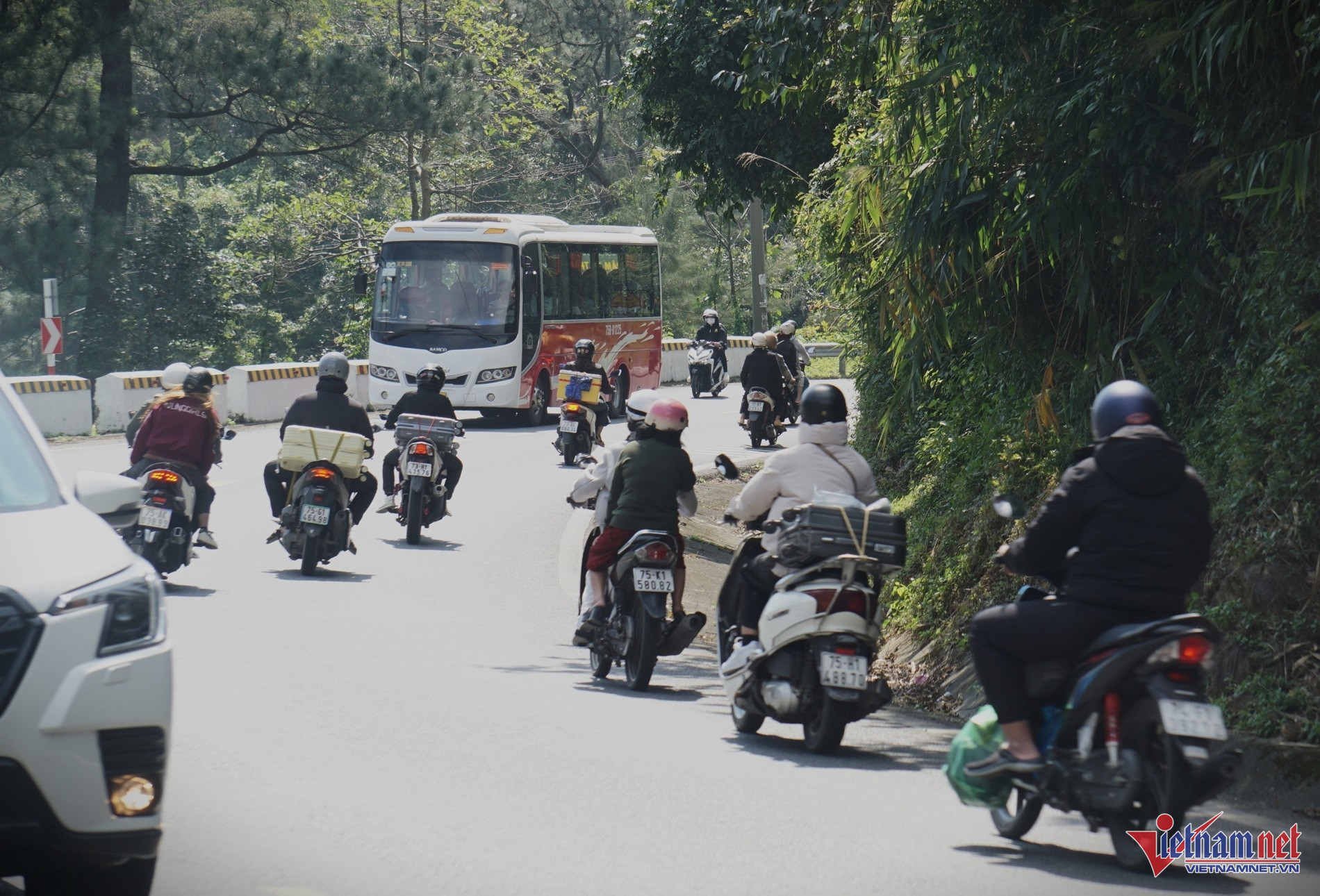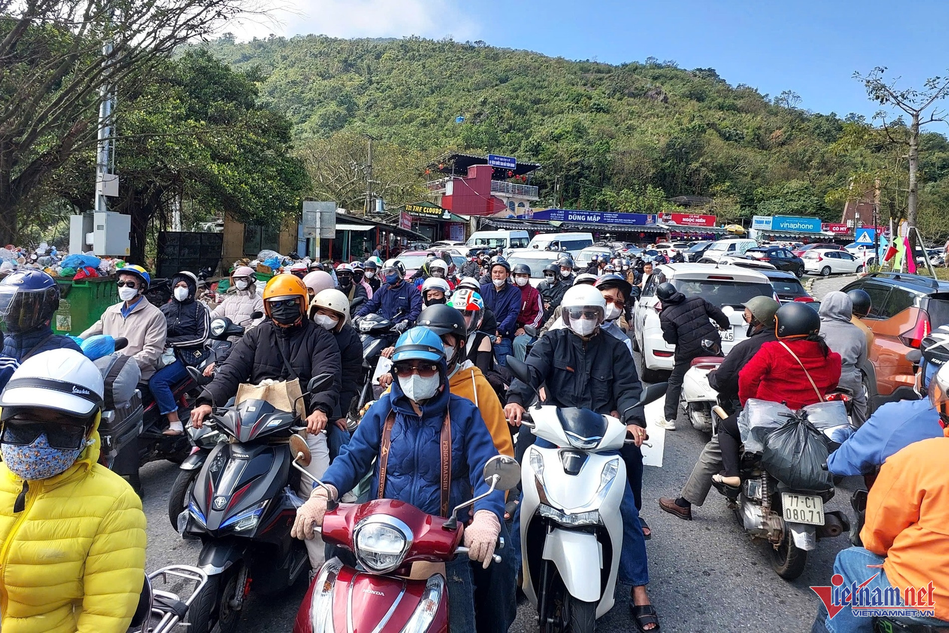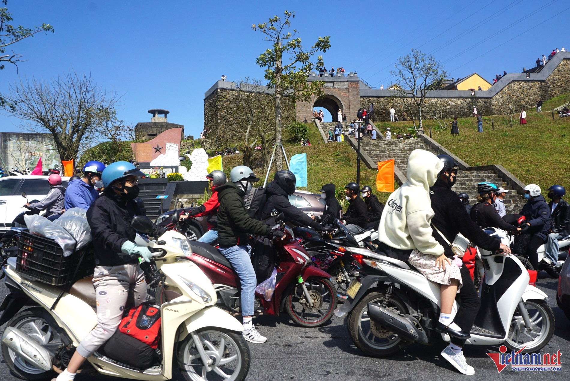 Trưa cùng ngày, khu vực đỉnh đèo Hải Vân kẹt cứng phương tiện. Trước khu vực di tích Hải Vân Quan, ô tô, xe máy nối đuôi nhau, ùn ứ hơn 1km khi lượng phương tiện di chuyển đường đèo quá đông.