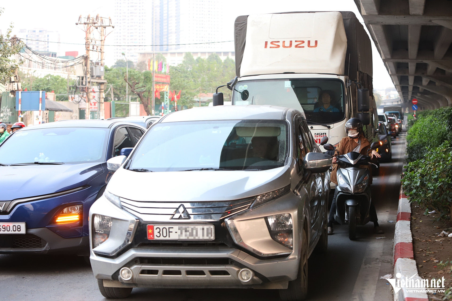Do số lượng xe máy đi ngược chiều quá đông lại đứng tràn lan khắp ngã tư khiến nút giao Nghiêm Xuân Yêm - Phạm Tu luôn trong tình trạng hỗn loạn.