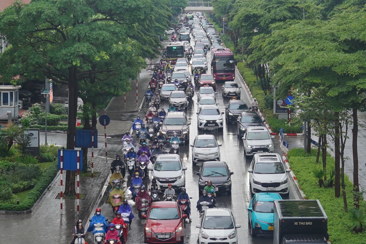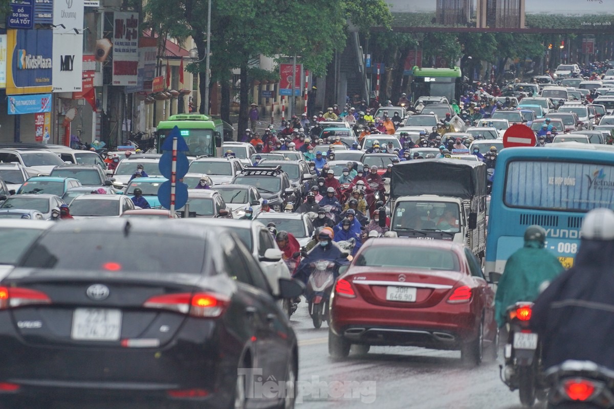 Lúc 7 giờ 30, từng dòng phương tiện ken đặc, chậm chạp di chuyển trên đường Trần Duy Hưng.