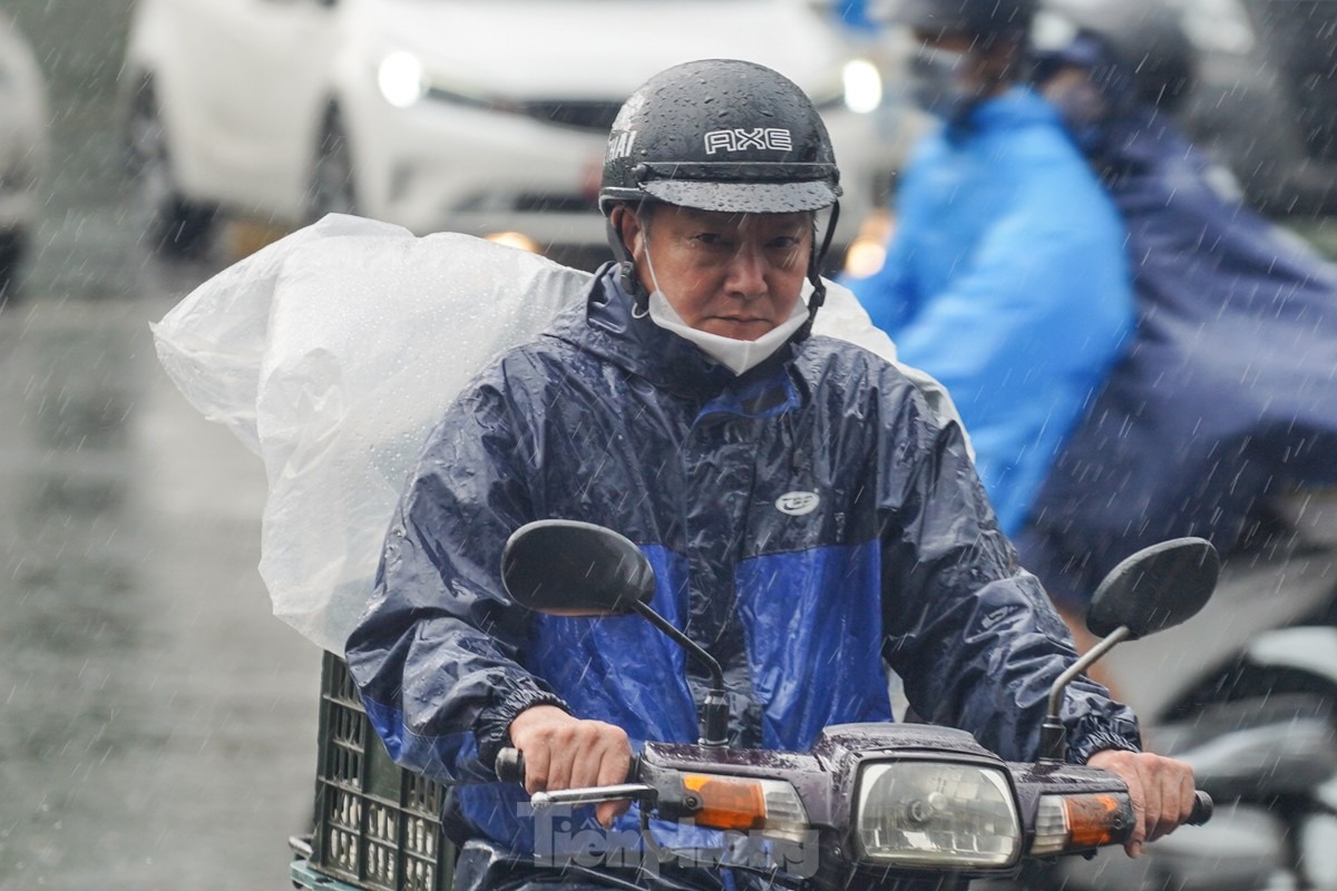 Cơn mưa sáng sớm khiến người lao động càng thêm vất vả khi di chuyển.
