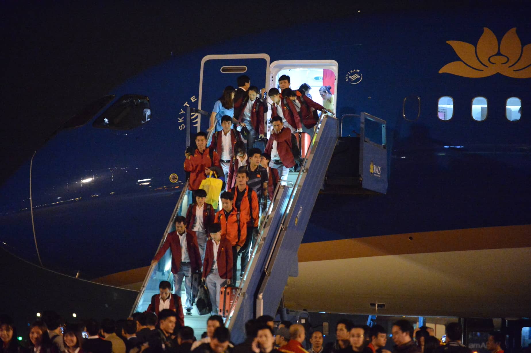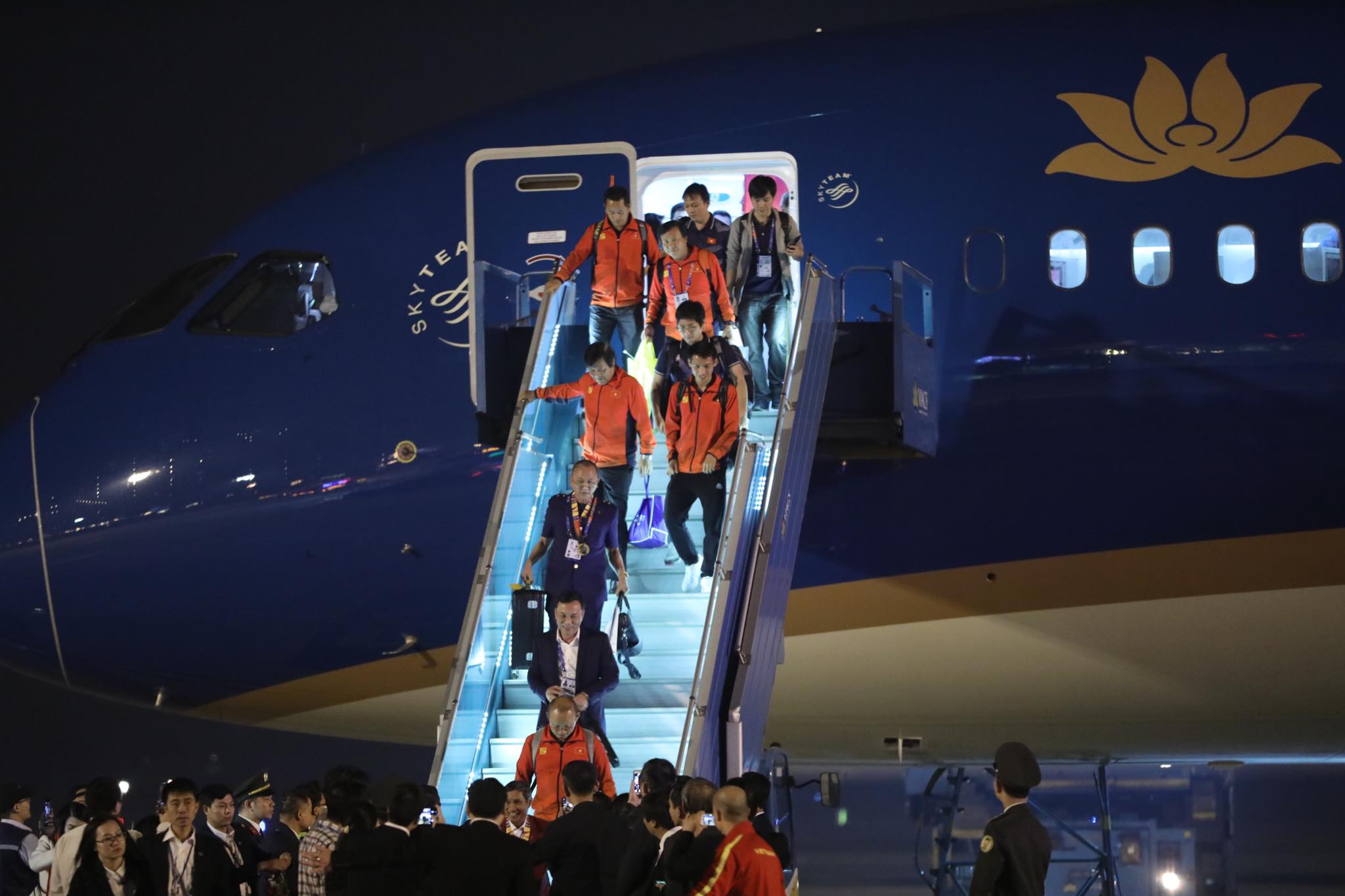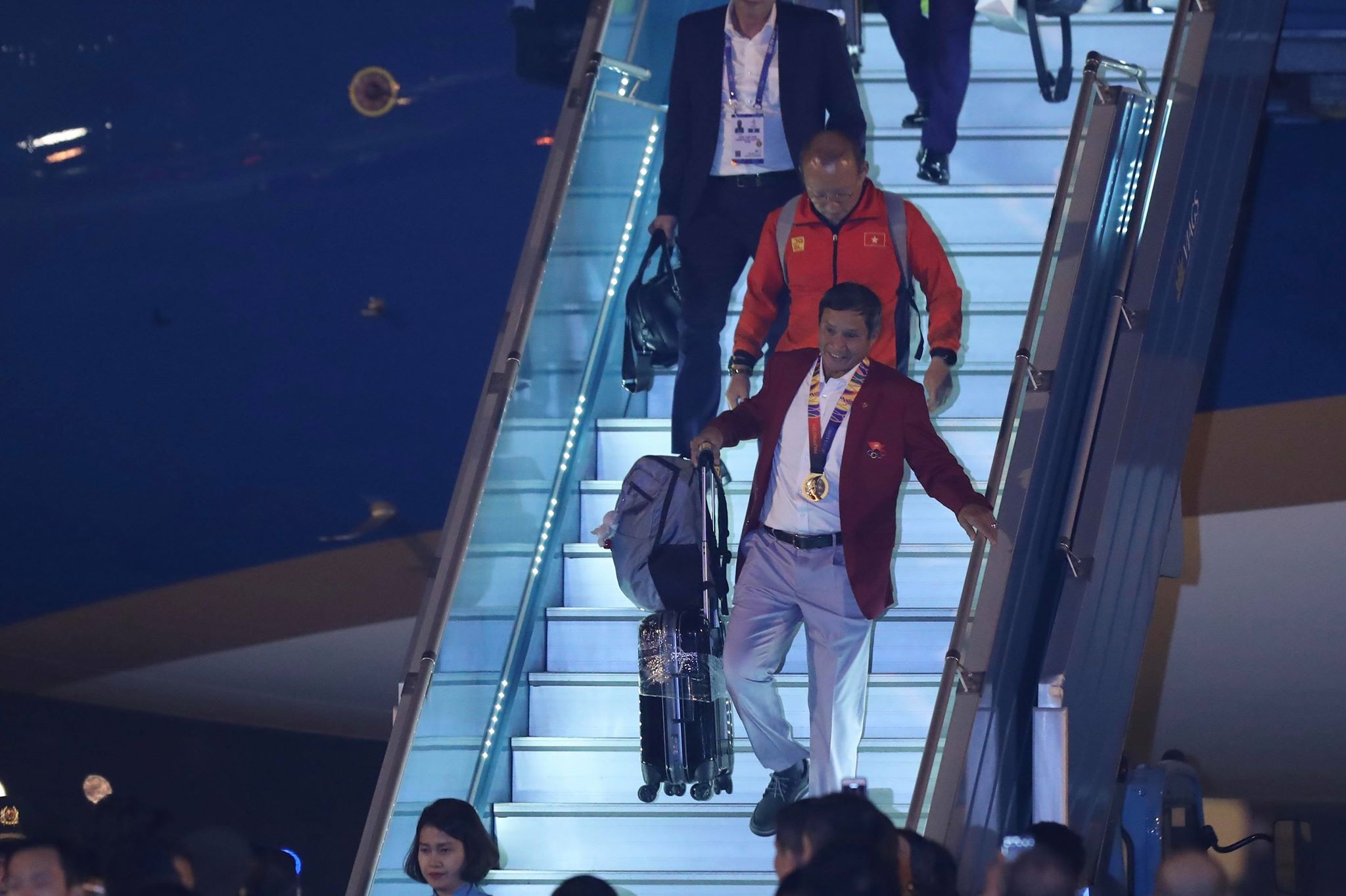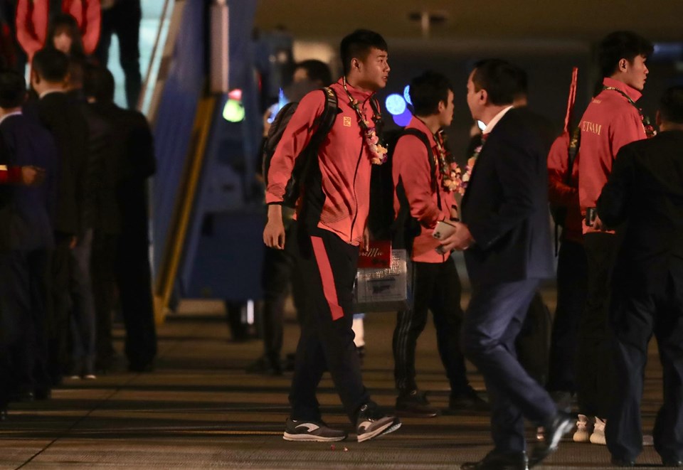 Đúng 19h, máy bay Boeing 787-10 chở đoàn thể thao Việt Nam dự SEA Games đã dừng bánh tại sân đỗ. Hàng nghìn CĐV từ nhiều tỉnh thành nhuộm đỏ khu vực phía trước sảnh VIP sân bay quốc tế Nội Bài hò reo khi thấy những người hùng của bóng đá Việt Nam mang HCV lịch sử từ SEA games 30 trở về.