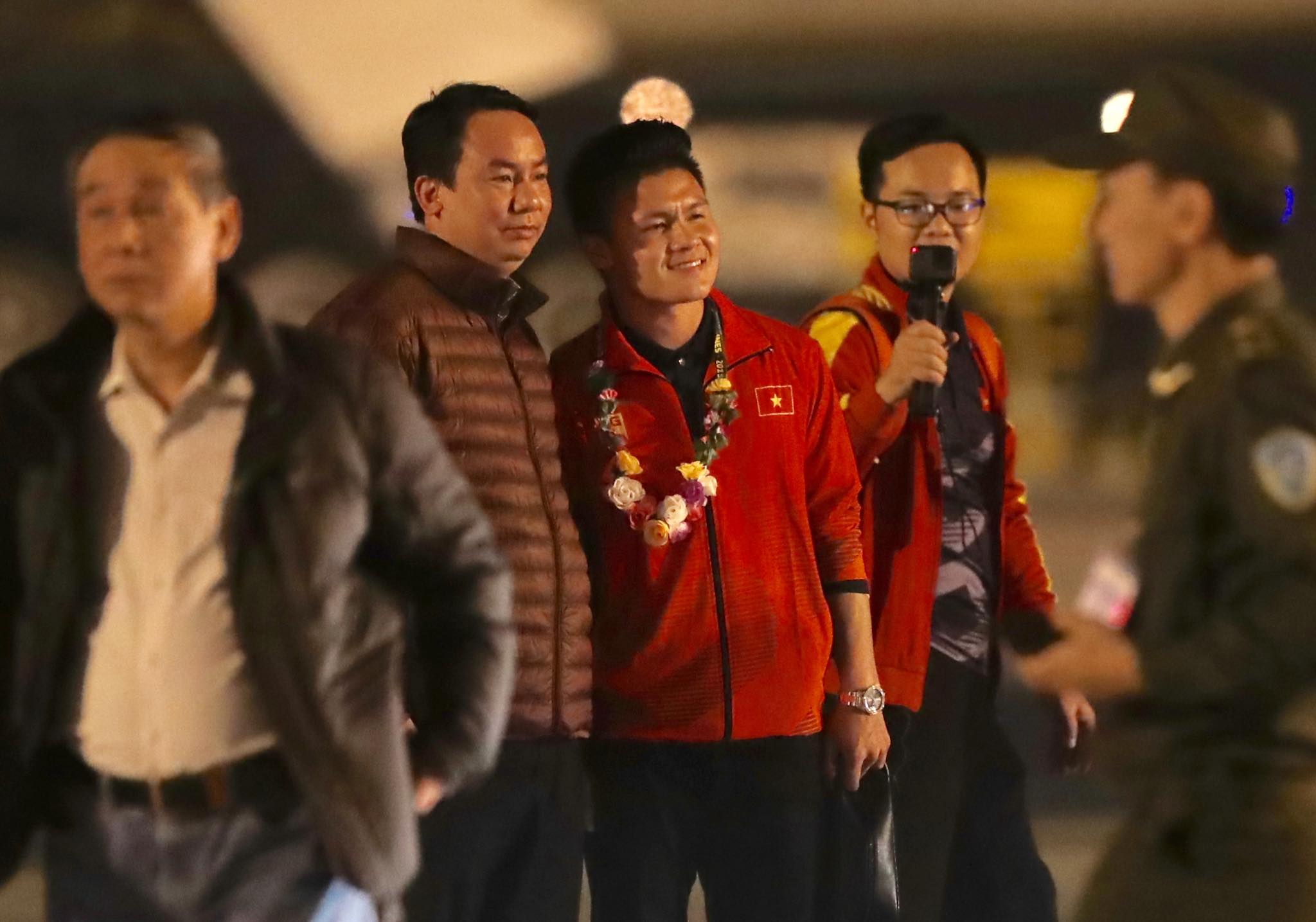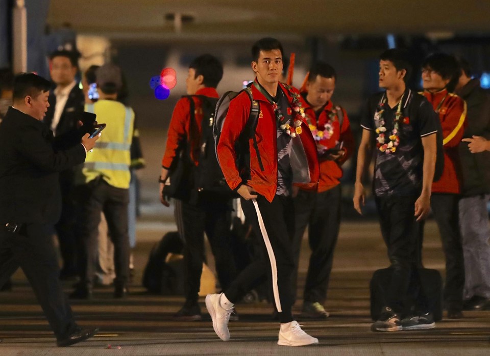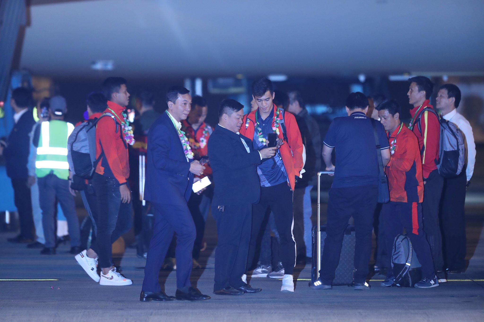 Đúng 19h, máy bay Boeing 787-10 chở đoàn thể thao Việt Nam dự SEA Games đã dừng bánh tại sân đỗ. Hàng nghìn CĐV từ nhiều tỉnh thành nhuộm đỏ khu vực phía trước sảnh VIP sân bay quốc tế Nội Bài hò reo khi thấy những người hùng của bóng đá Việt Nam mang HCV lịch sử từ SEA games 30 trở về.