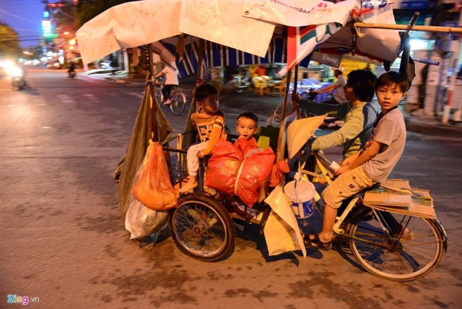 | Chị kể đêm giáng sinh vừa rồi chị nhặt ve chai đến 4 - 5h sáng mới về vì hôm đó có đông người vui chơi nên lượm được nhiều. Những hôm mưa gió chị và các con phải núp trong một mái hiên che tạm, tạnh mưa cả nhà lại tiếp tục lên đường. |