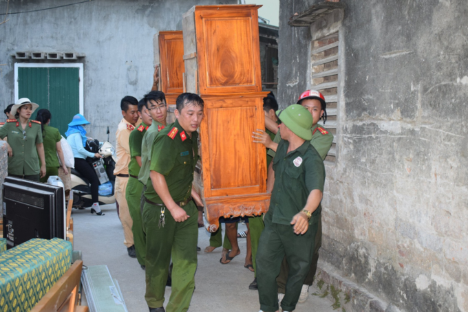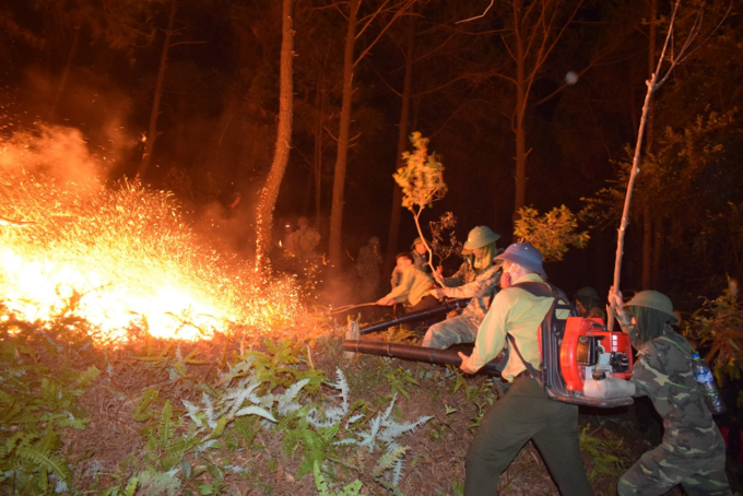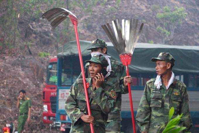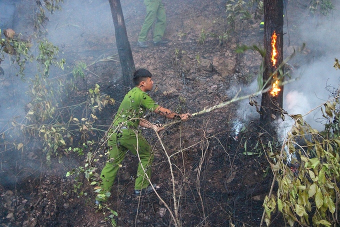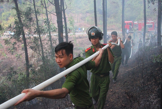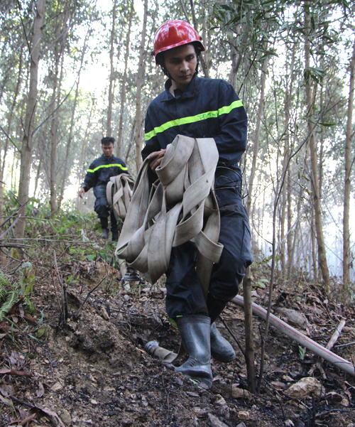 Công an, bộ đội phải dùng vai làm giá đỡ đưa vòi rồng vào sâu trong rừng dập lửa.
