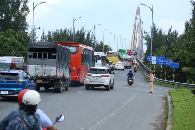 Do lưu lượng xe quay lại TP HCM rất nhiều nên lực lượng CSGT 2 tỉnh Tiền Giang và Bến Tre đã phải "cắt đường", không cho phương tiện lên cầu Rạch Miễu, để lượng xe từ Bến Tre về Tiền Giang đi cả 2 làn đường nhằm giải tỏa ùn tắc. Đến 19 giờ 30 phút cùng ngày, lượng xe vẫn còn rất đông.
