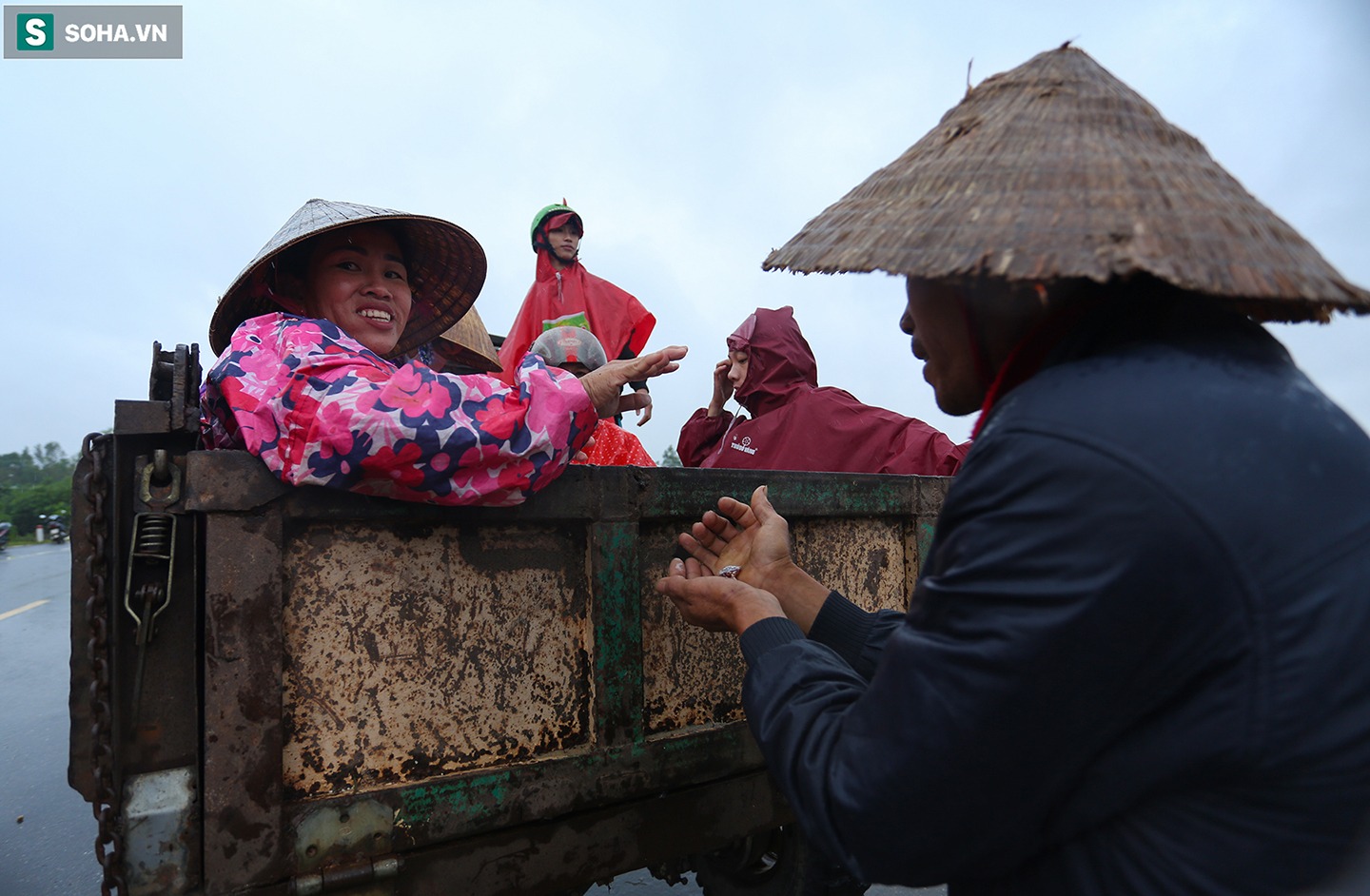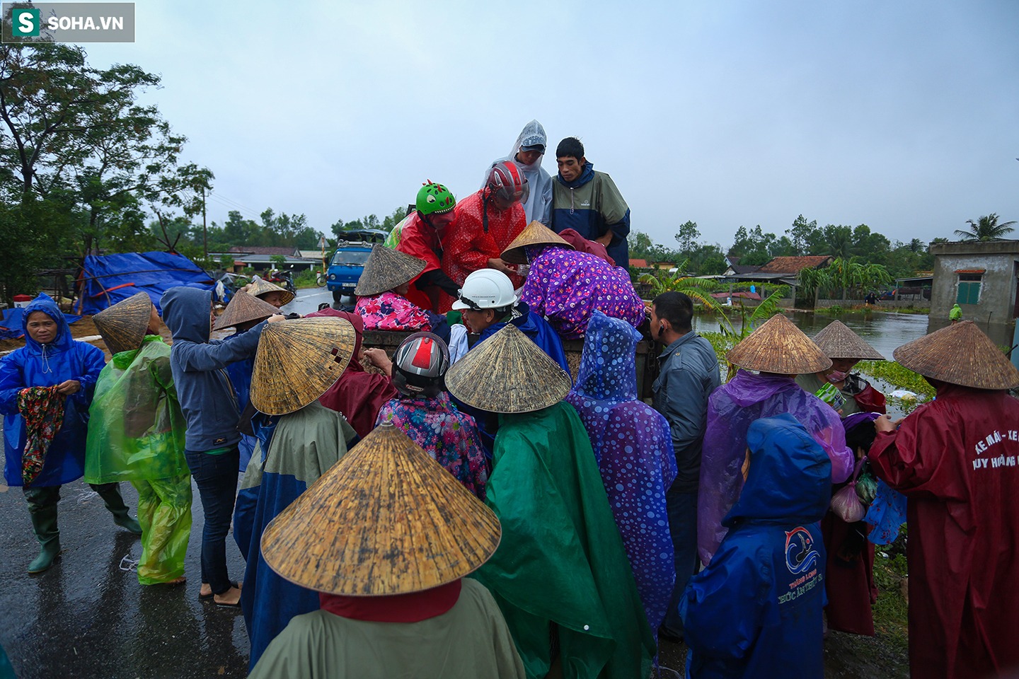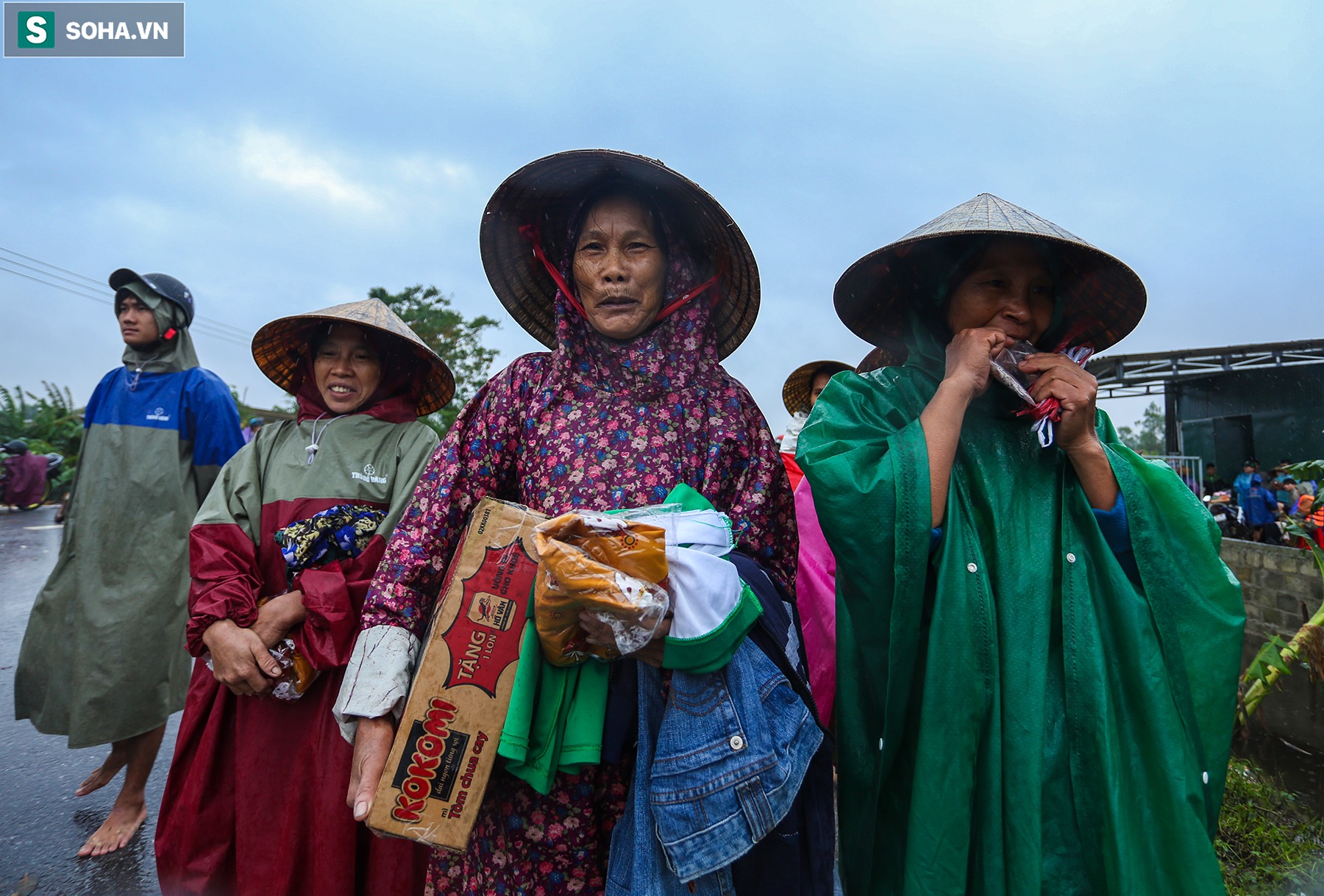 Trên Quố lộ 1A (đoạn qua thôn Tây Giáp, xã Hưng Thuỷ, huyện Lệ Thuỷ), hàng chục người dân vùng lũ xếp hàng dưới mưa chờ đợi nhận hàng cứu trợ.