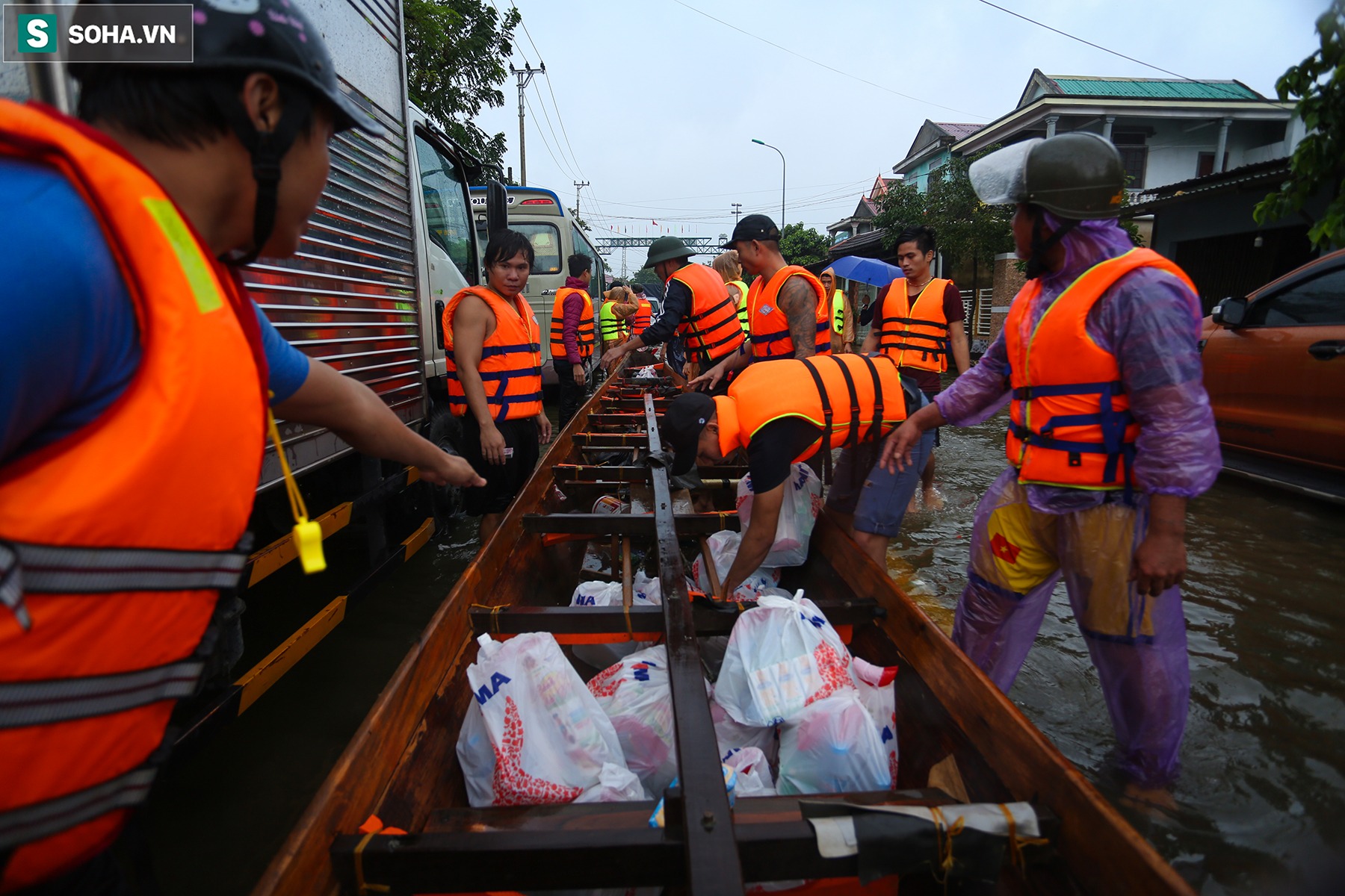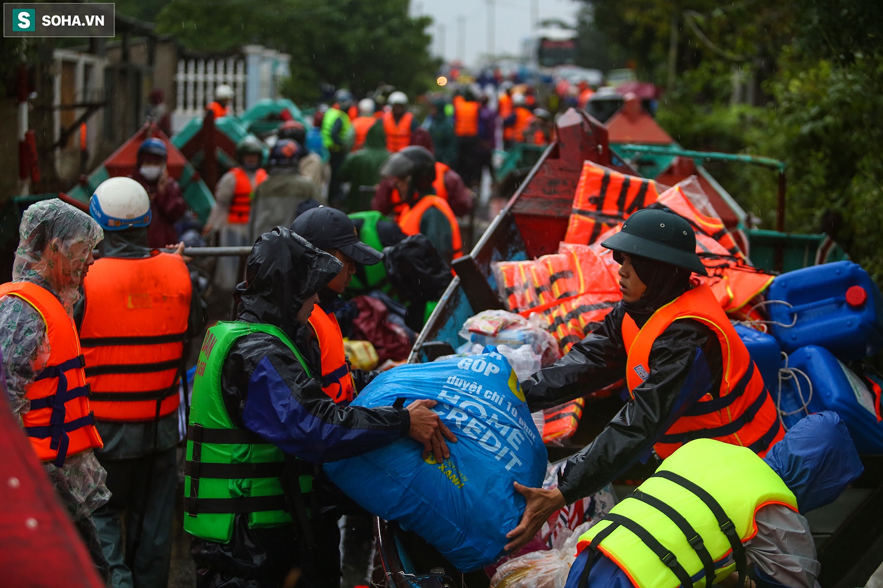 Trong 2 hôm nay, các loại nhu yếu phẩm như đồ ăn, nước uống, áo phao, áo quần... của nhiều đoàn cứu trợ từ khắp cả nước tập trung tại một số điểm trên Quốc lộ 1A để phân phát cho người dân ở các vùng bị cô lập nhiều ngày qua.
