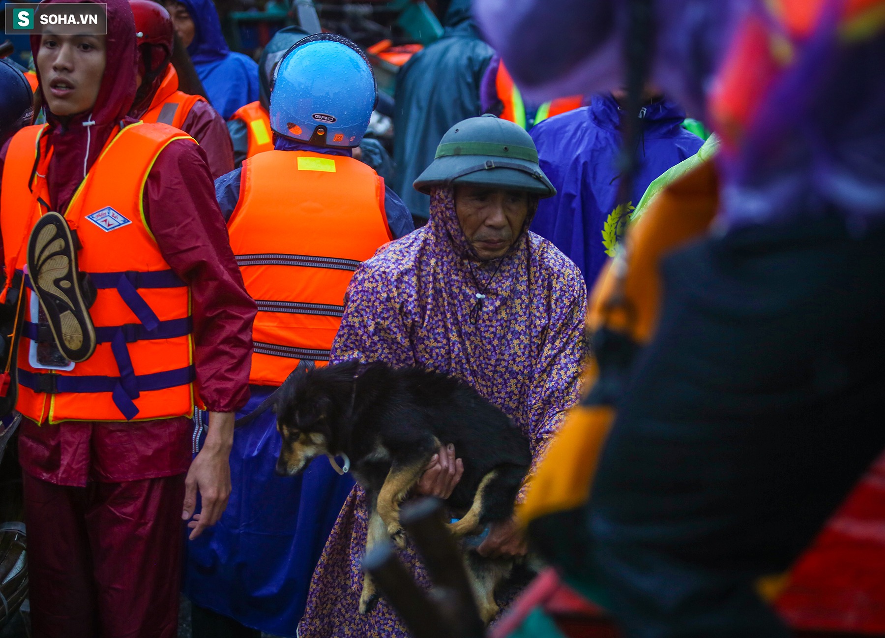 Trong khi đó, ông Ninh (ngụ xã Cam Thuỷ, Lệ Thuỷ) được lực lượng cứu hộ giải cứu ra khỏi vùng ngập nặng, vội vàng ôm theo chú chó của mình tới nơi an toàn.