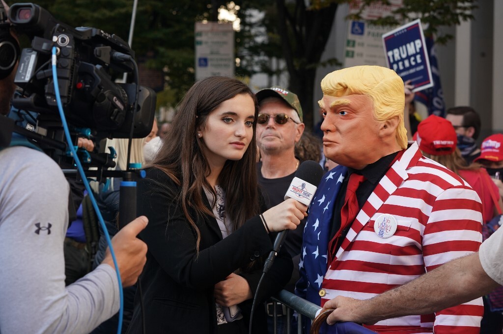 Một người hóa trang thành Tổng thống Mỹ trả lời phỏng vấn của phóng viên truyền hình bên ngoài Trung tâm Hội nghị Pennsylvania, khi công tác kiểm phiếu diễn ra bên trong.