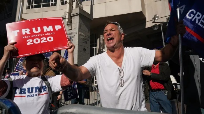 Một người ủng hộ Trump hét và chỉ tay về phía người ủng hộ Biden bên ngoài Trung tâm Hội nghị Pennsylvania.