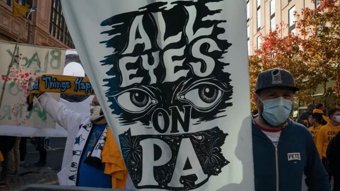 Một người biểu tình cầm biểu ngữ in chữ "Mọi con mắt đang quan sát Pennsylvania" bên ngoài Trung tâm Hội nghị Pennsylvania.