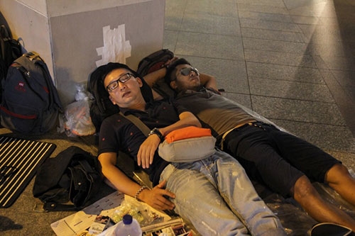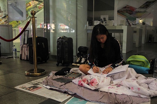 Vừa trải qua chuyến bay gần 2 tiếng và phải xếp hàng từ sớm, nhiều người tỏ rõ sự mệt mỏi và đã trải chăn chiếu, giấy báo để ngủ tạm. Với một số, đây là lần thứ hai, thứ ba xếp hàng chờ mua iPhone nên họ chuẩn bị tư trang gọn gàng nhưng khá đầy đủ. |