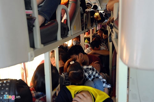 Ông Phạm Văn Đoàn, đội thanh tra giao thông quận Nam Từ Liêm cho biết, trong 6 ngày nghỉ lễ, đơn vị phạt tiền hơn 30 nhà xe cố tình chở quá tải và không có đăng ký kinh doanh. Ngoài ra, đơn vị cũng đã hạ tải, nhắc nhở hàng trăm lượt xe khách chở quá số người ngay trong bến trước khi khởi hành. Chiều 3/5, lực lượng thanh tra tiếp tục phối hợp với các lực lượng liên ngành xử lý xe dừng trả đón khách sai quy định trước khi vào bến. Trong ảnh: xe khách giường nằm Quang Thu chạy tuyến Thanh Hóa - Mỹ Đình chở quá 20 người. Hành khách ngồi la liệt dọc hai hàng ghế nằm. |