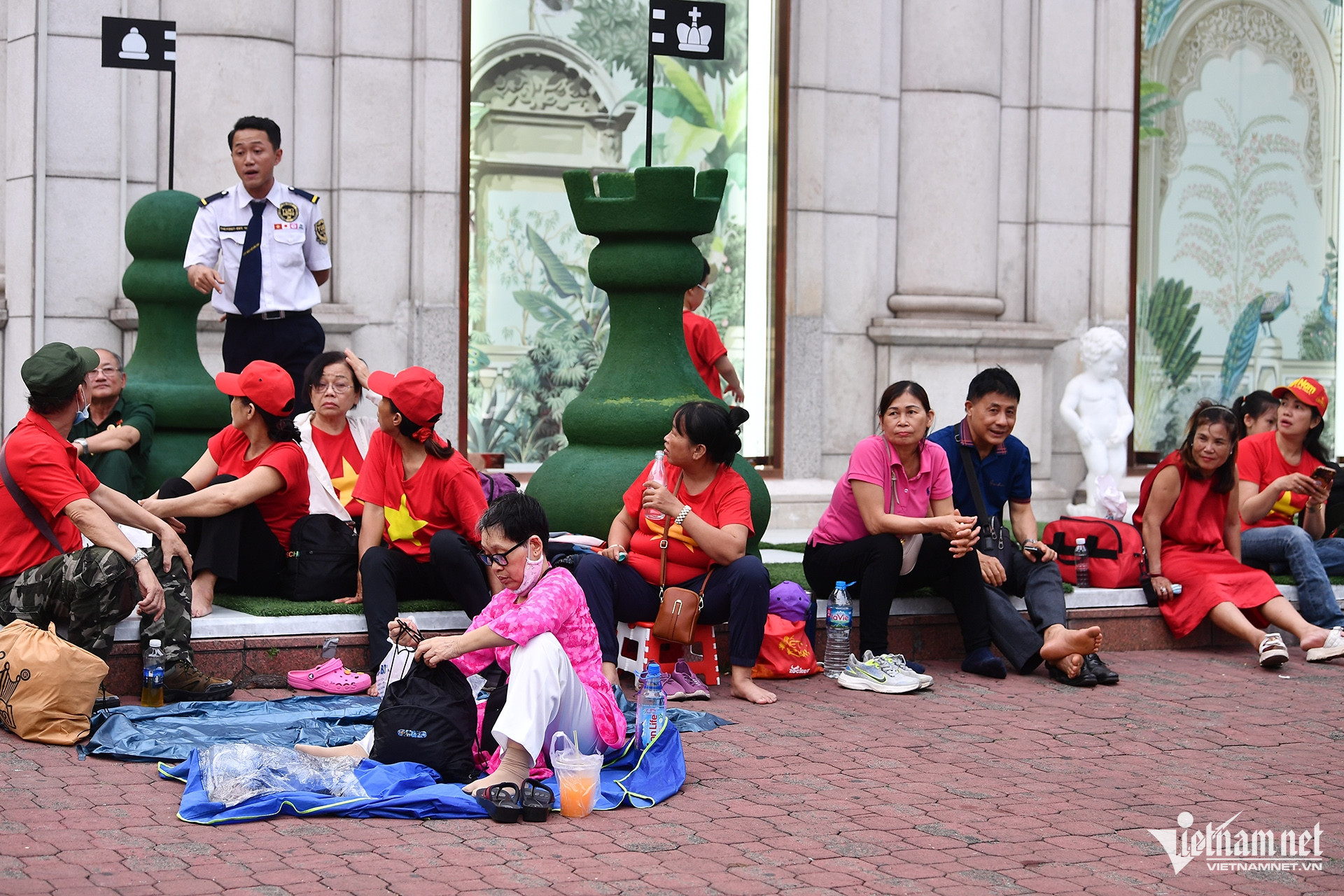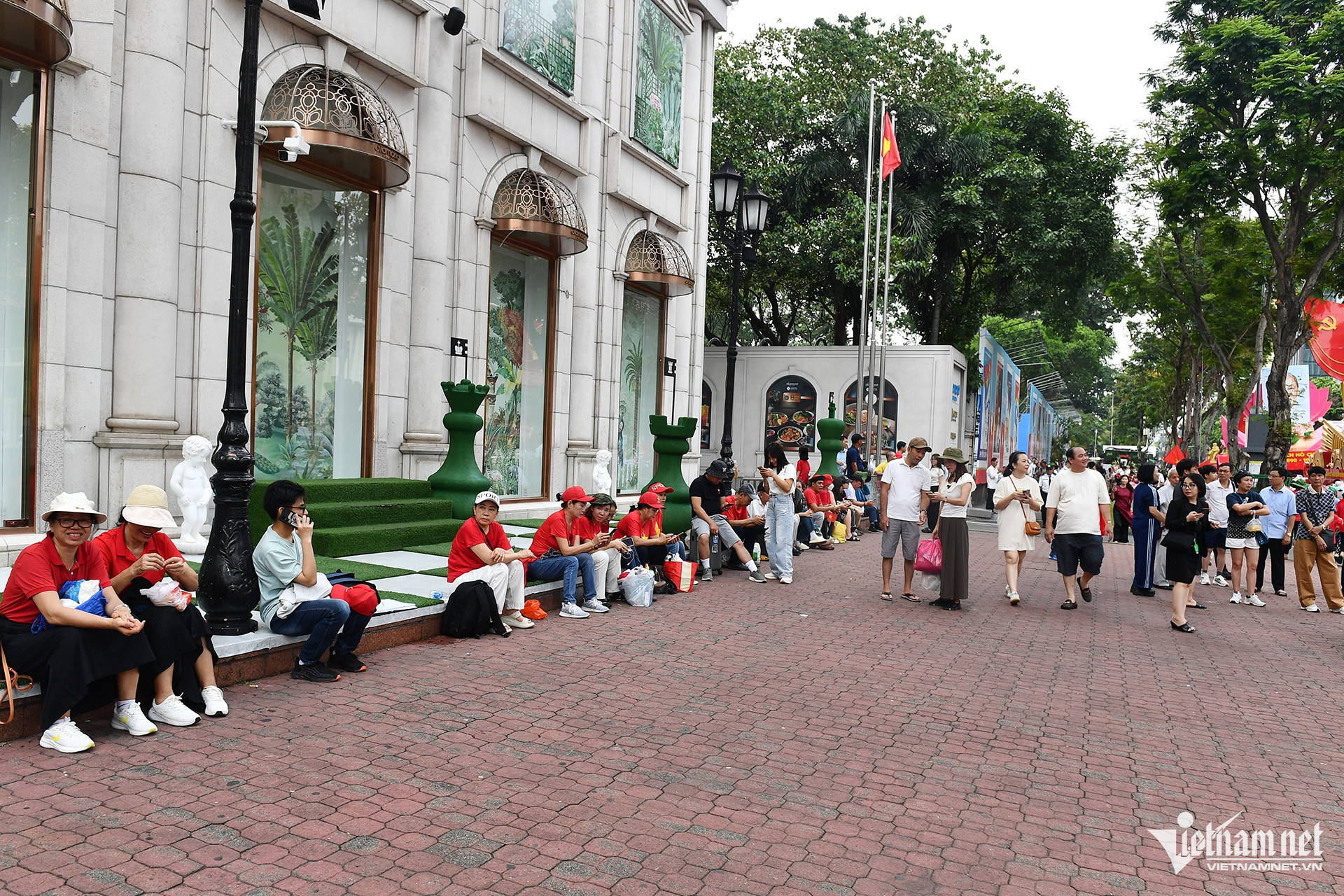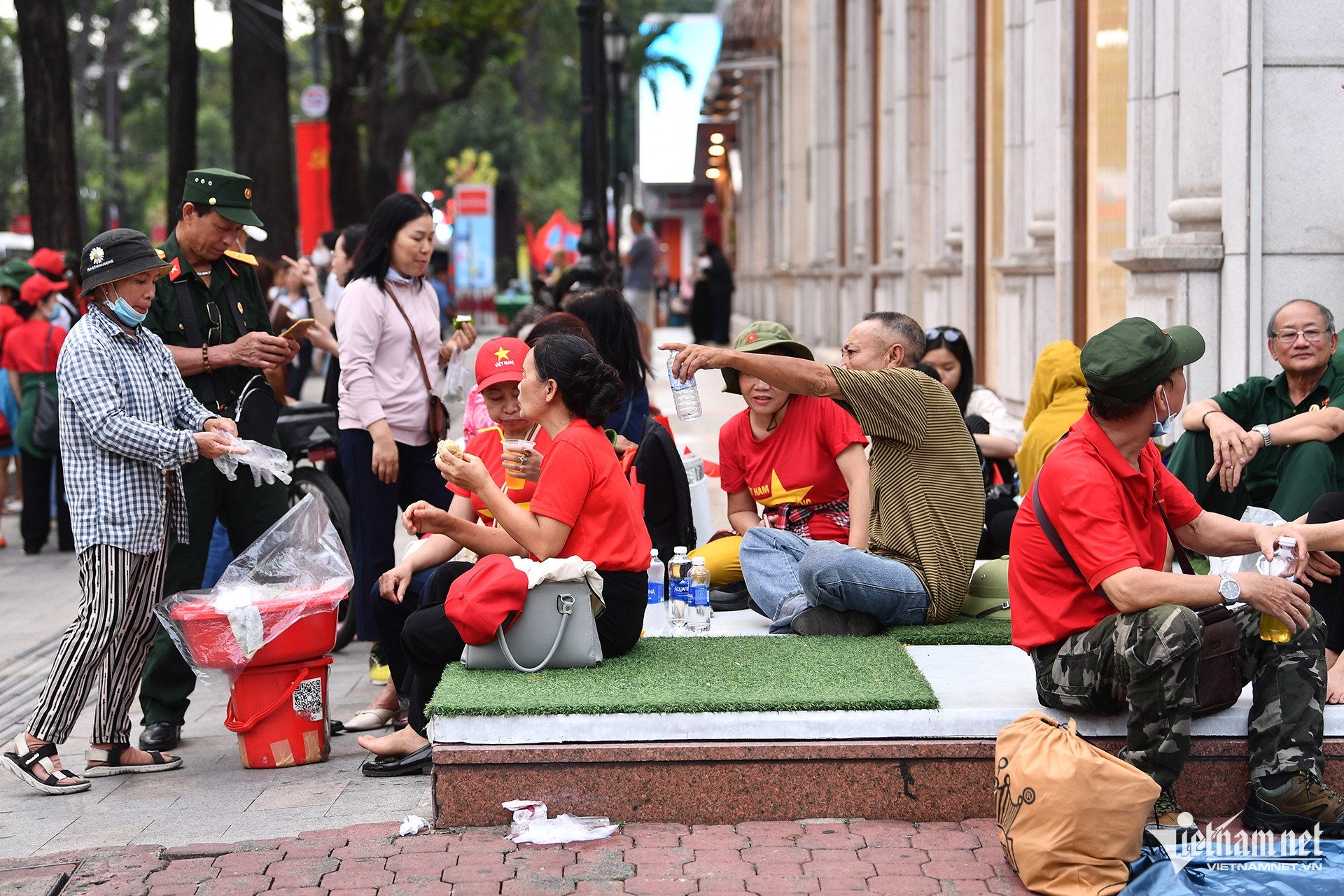 Xung quanh chân tòa nhà Diamond, nhiều nhóm du khách từ các tỉnh về ngồi xí chỗ sớm. Trong số này có người chỉ tới TPHCM xem diễu binh rồi hôm sau về luôn mà không thuê phòng nghỉ qua đêm.
