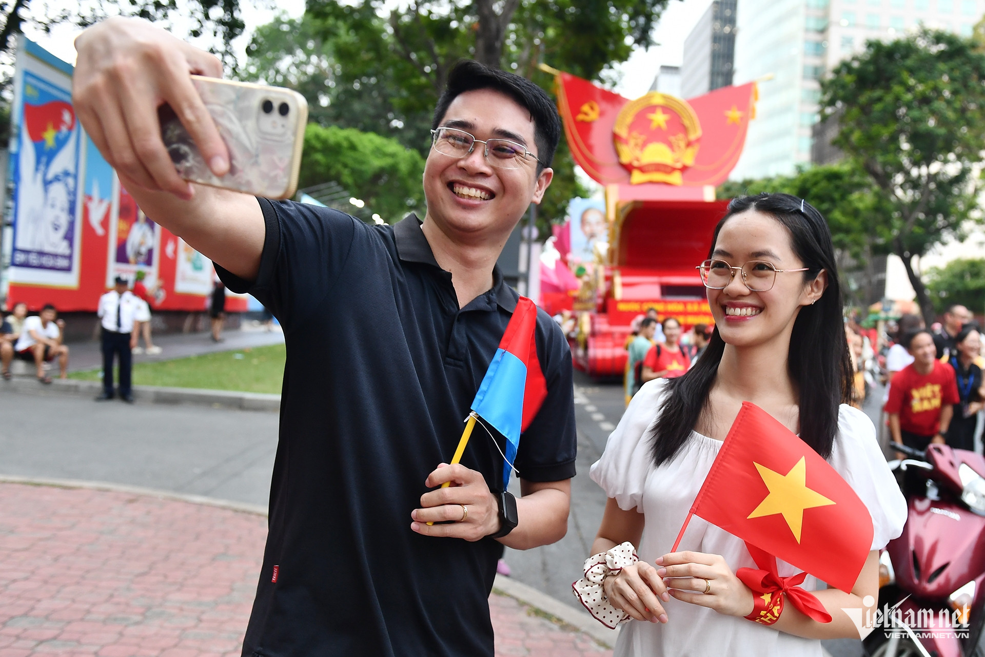Tại khu vực tập kết xe hoa, anh Bùi Việt Hùng và vợ thích thú chụp ảnh với chiếc xe mô hình Quốc huy.