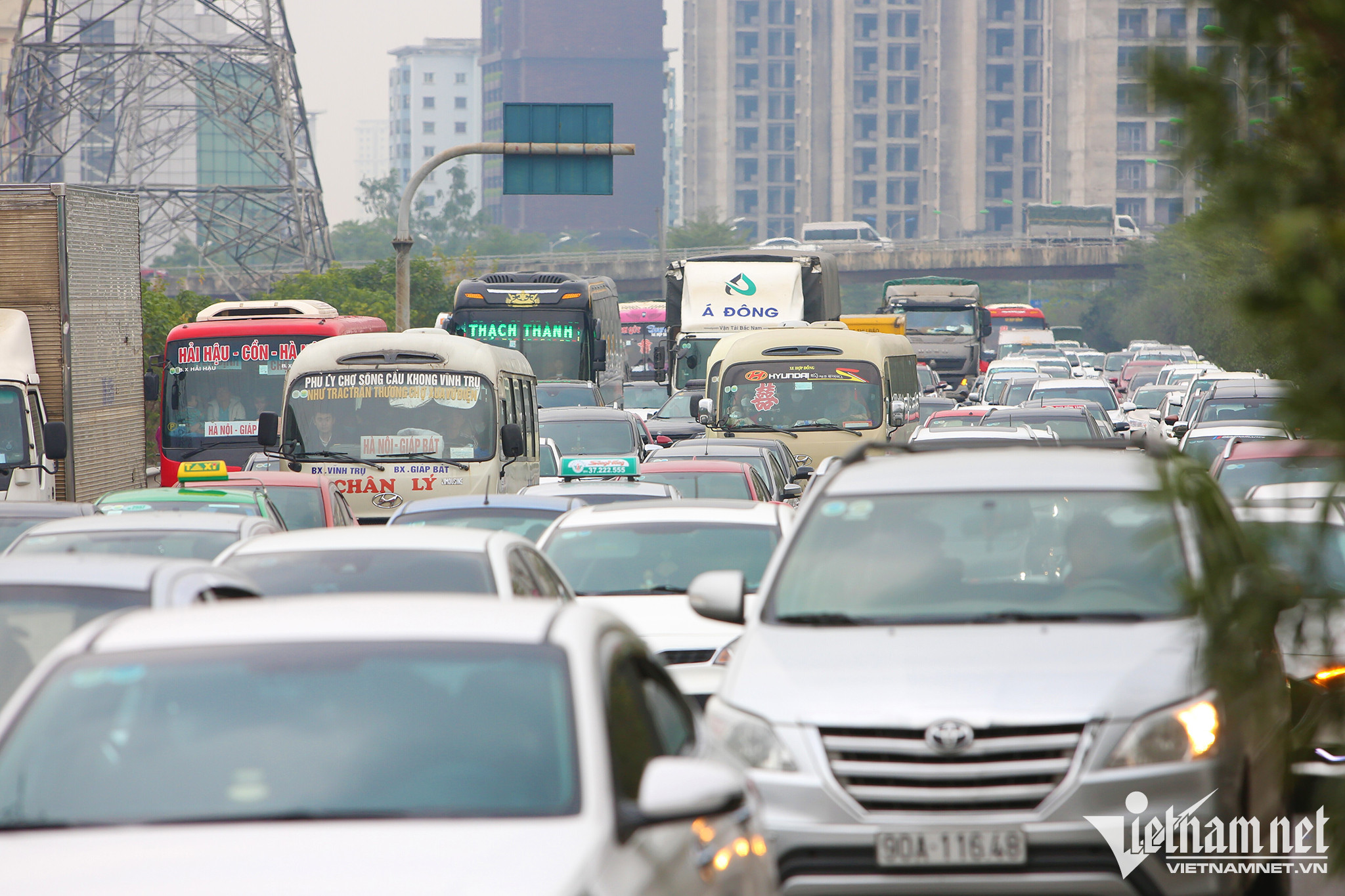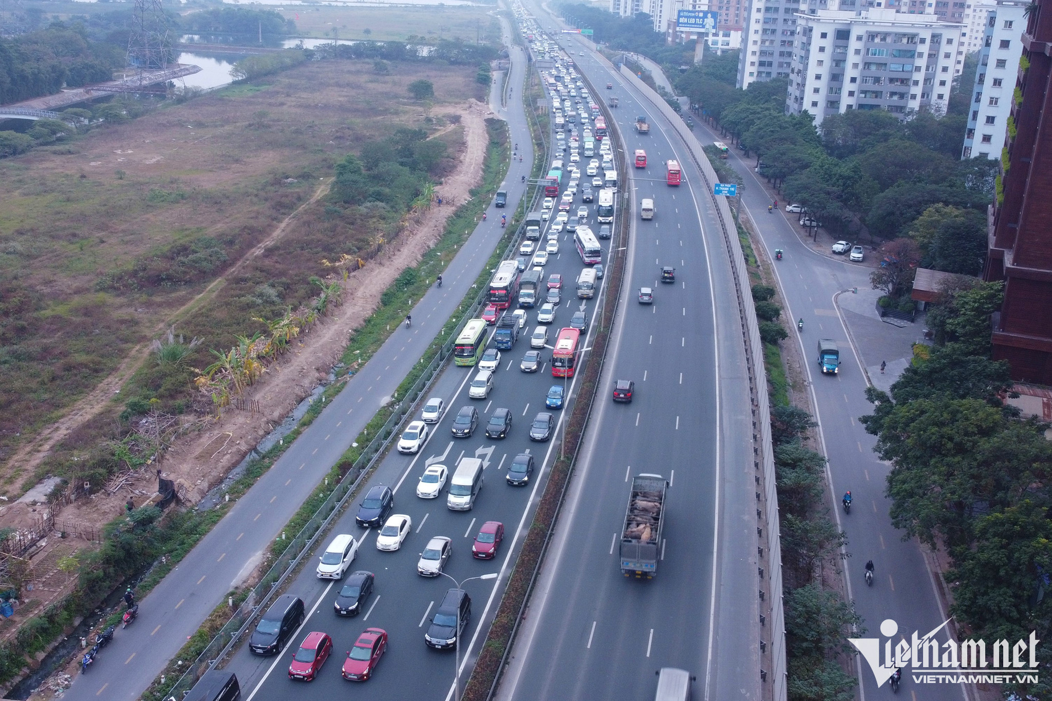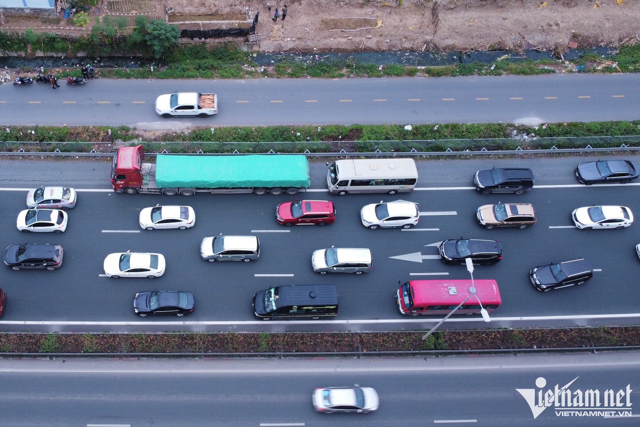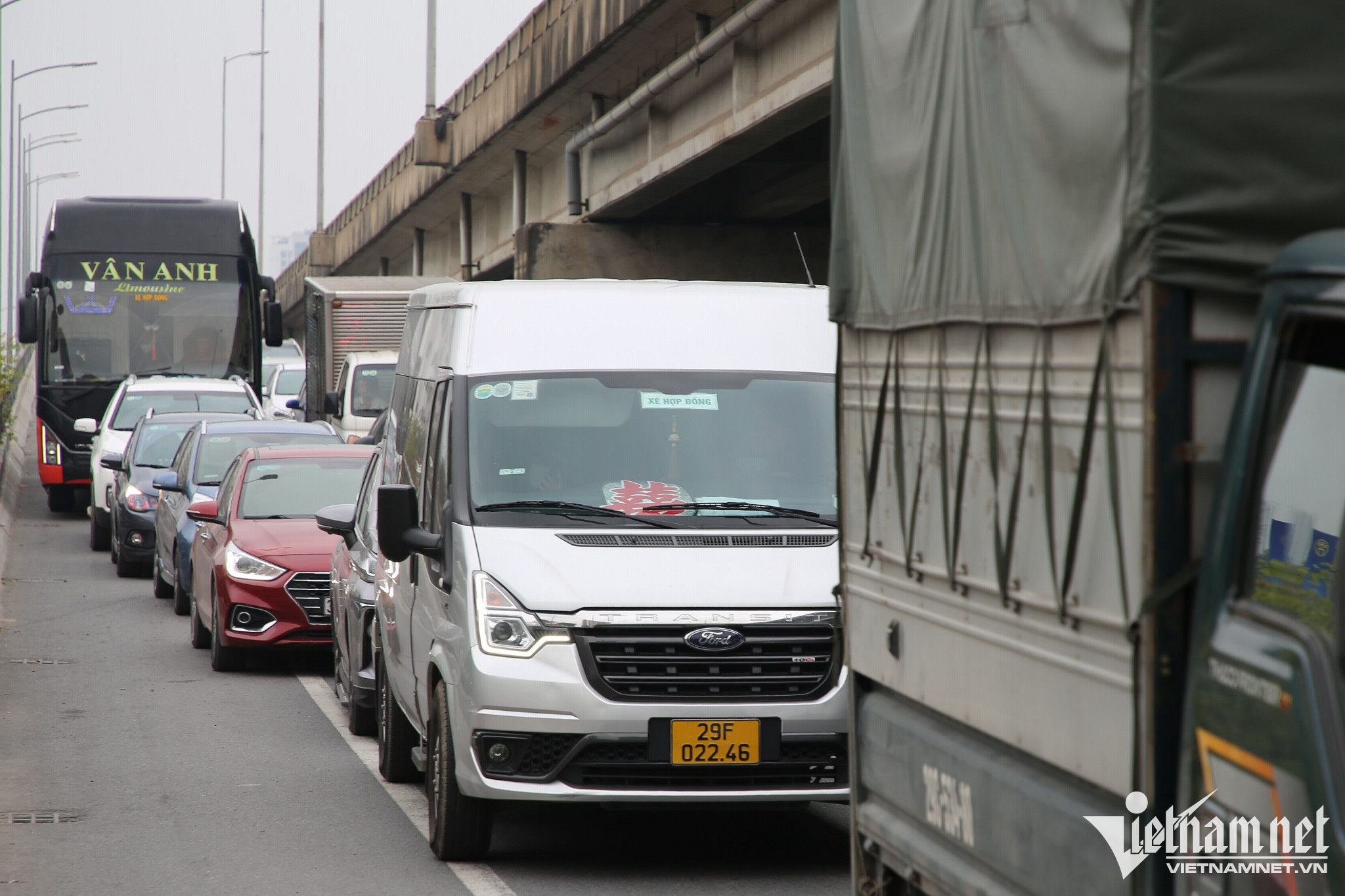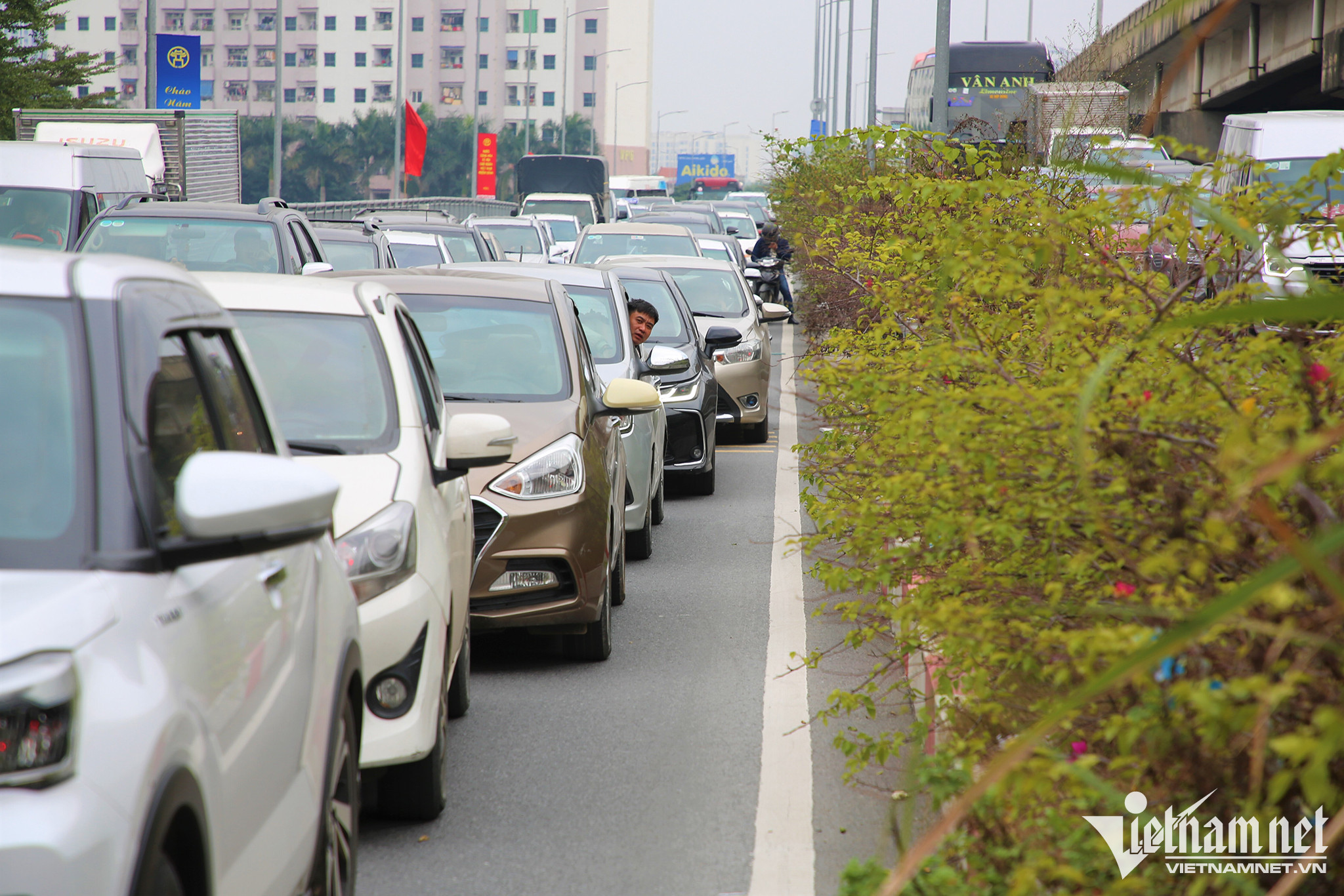 Tại nút giao giữa cao tốc Pháp Vân – Cầu Giẽ và đường dẫn lên vành đai 3 trên cao, lượng phương tiện đã ùn cục bộ kéo dài hơn 1km. Các phương tiện đi thành 3 hàng, chiếm hết làn khẩn cấp.