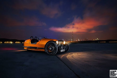 Siêu xe 3 bánh Morgan tỏa sáng trong bóng đêm. |