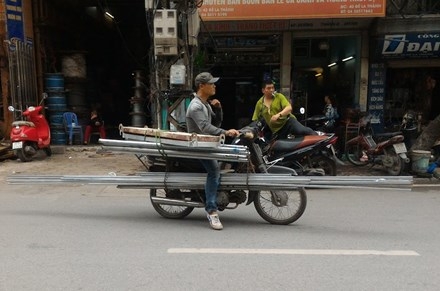 Xe thường xuyên chở hàng hóa là vật liệu xây dựng, sắt thép vừa nặng vừa cồng kềnh. Không khó để thấy nhiều xe chở những thanh thép dài gấp 3, gấp 4 lần trọng lượng xe nhưng vẫn bon bon trên đường phố.