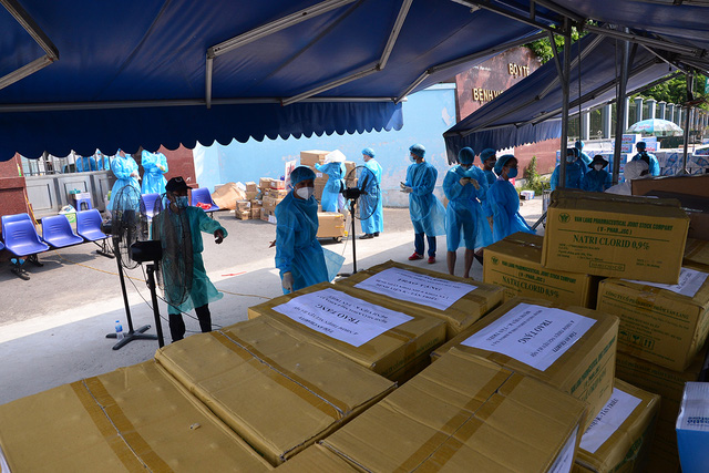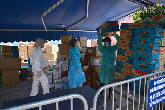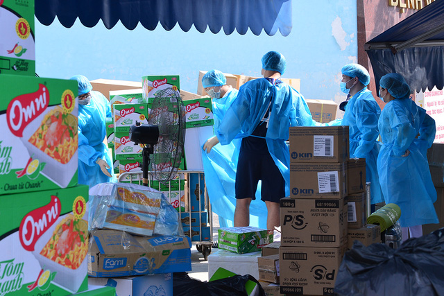 Nơi tiếp nhận hàng hóa phía ngoài cổng luôn kín các xe tải, đôi khi phải xếp hàng, xe sau chờ xe trước bốc dỡ xong mới có chỗ tiến vào. Cả bên trao, bên nhận đều hết sức hợp tác, tạo điều kiện cho nhau hoàn thành công việc, cùng đồng lòng trong cuộc chiến chung chống đại dịch.