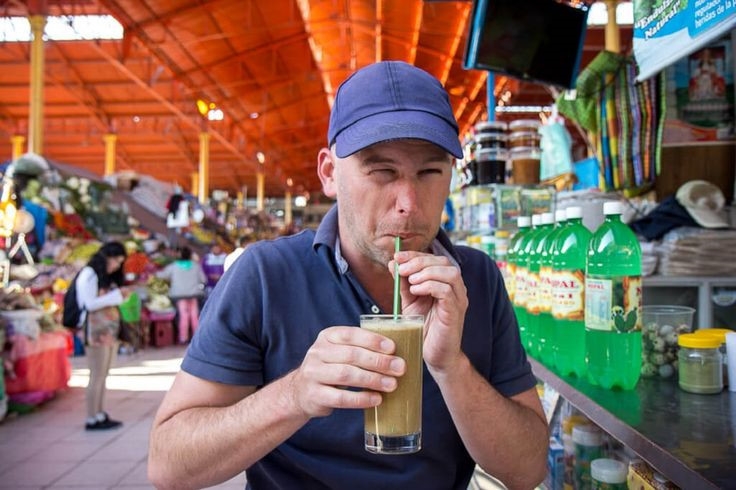 | Sinh tố nhái sống (Lima, Peru): Được cho là có thể chữa các bệnh về hen suyễn và tăng cường sinh lực cho nam giới, món sinh tố này gồm nhái được lột da, làm sạch nội tạng, sau đó xay nhuyễn cùng cà rốt, rễ maca Peru và mật ong. Ảnh: This Is Insider. |