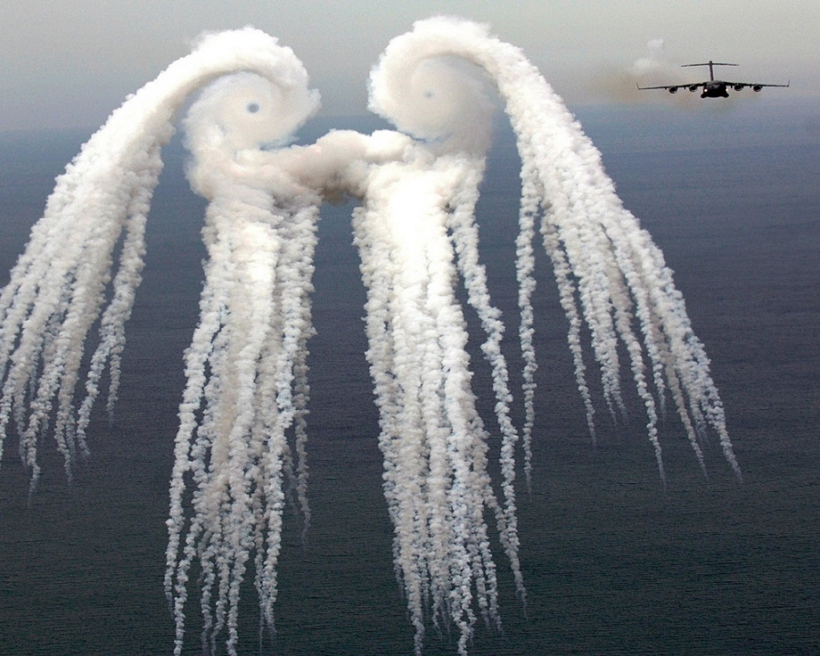1. Đám khói có hình dạng đặc biệt này do chiếc C-17 Globemaster III (một loại máy bay vận tải quân sự chiến thuật cỡ lớn của Mỹ) tạo ra. Những pha nhào lộn, quay vòng trên không đã khiến đám khói trở thành hình thù tuyệt đẹp như thế này. |