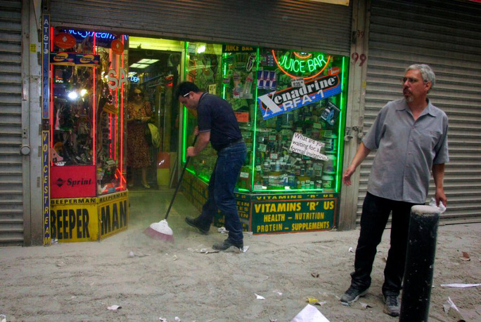 Có những hình ảnh về sự quyết tâm, bao gồm những người lính cứu hỏa làm việc giữa đống đổ nát còn nghi ngút khói và một người bán hàng đang quét bụi sau thảm họa.