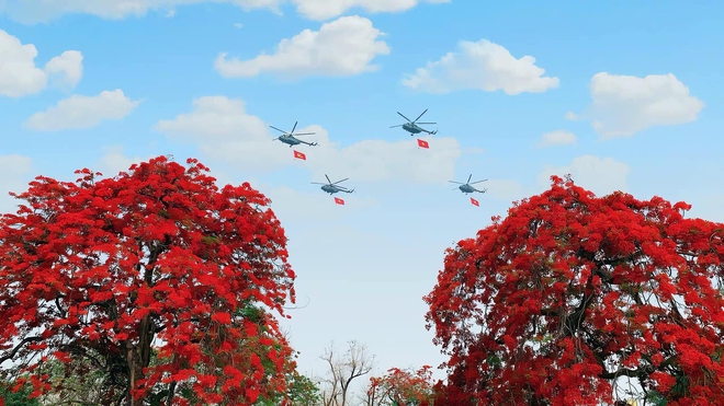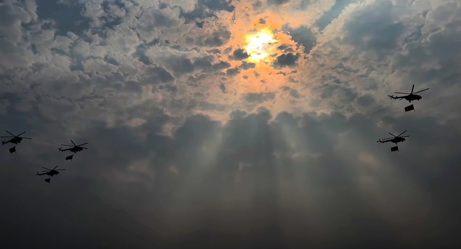Trong tiết trời nắng nóng tại TP Điện Biên Phủ, biên đội trực thăng bay qua Sân vận động, qua nhiều con đường, tuyến phố rợp cờ hoa, xuyên qua những tia nắng chói chang.