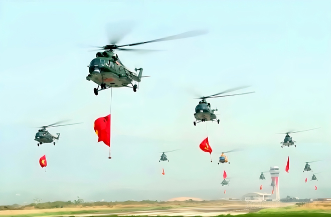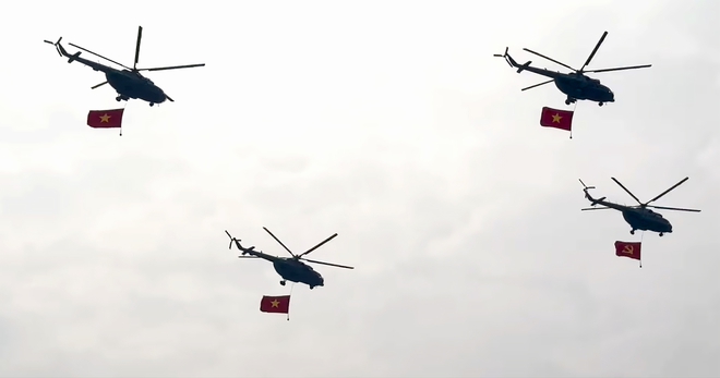 Đáng chú ý, nhiều ngày qua hình ảnh biên đội trực thăng treo Quốc kỳ Việt Nam và cở Đảng liên tiếp xuất hiện trên bầu trời Điện Biên.