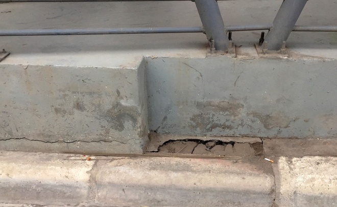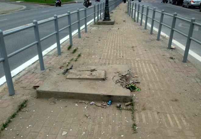 Đường dẫn nhà chờ La Khê có hố ga cao hơn mặt vỉa hè 20 cm; nắp hố ga sứt mẻ. |