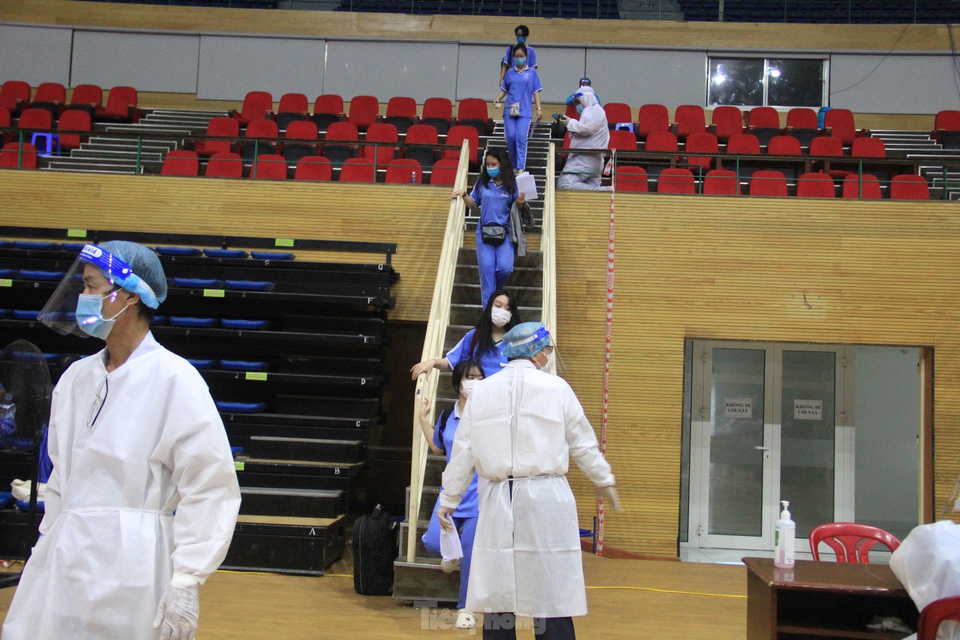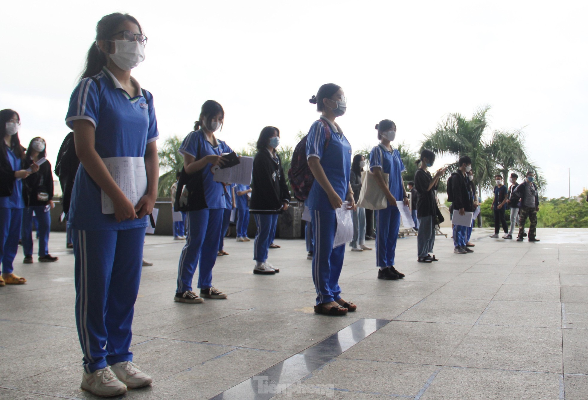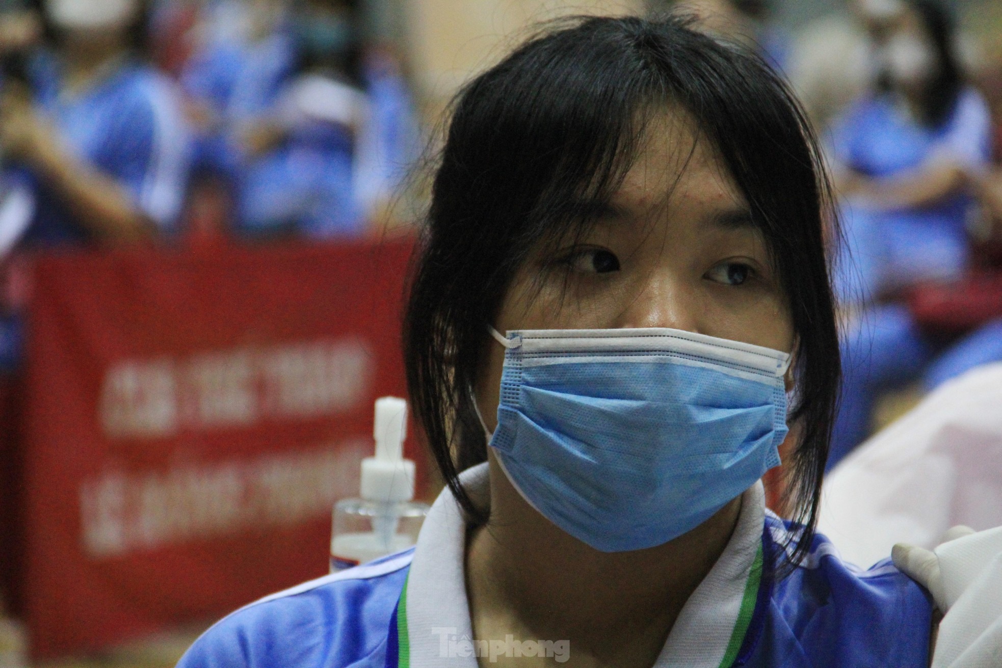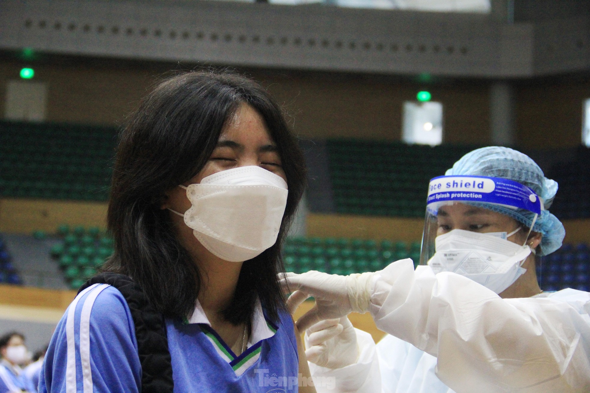 Tại Cung thể thao Tiên Sơn, điểm tiêm chủng lớn nhất thành phố, học sinh có mặt từ sáng sớm, xếp hàng ngay ngắn.