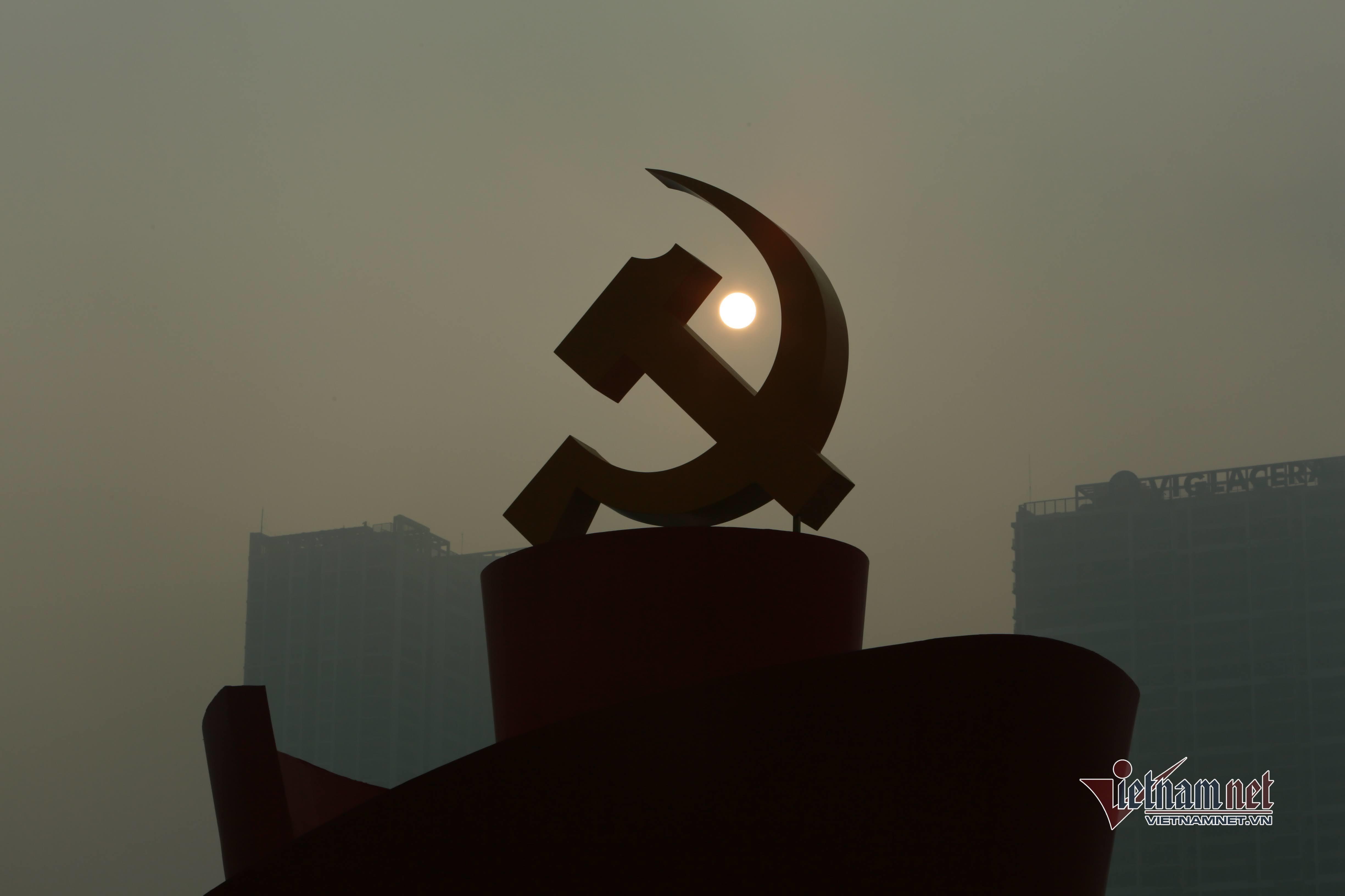 Phía trong sảnh chính, nhiều biểu tượng hình khối được lắp đặt. Nổi bật là biểu tượng búa liềm cùng dòng chữ Đại hội XIII được đặt tại vị trí trang trọng.