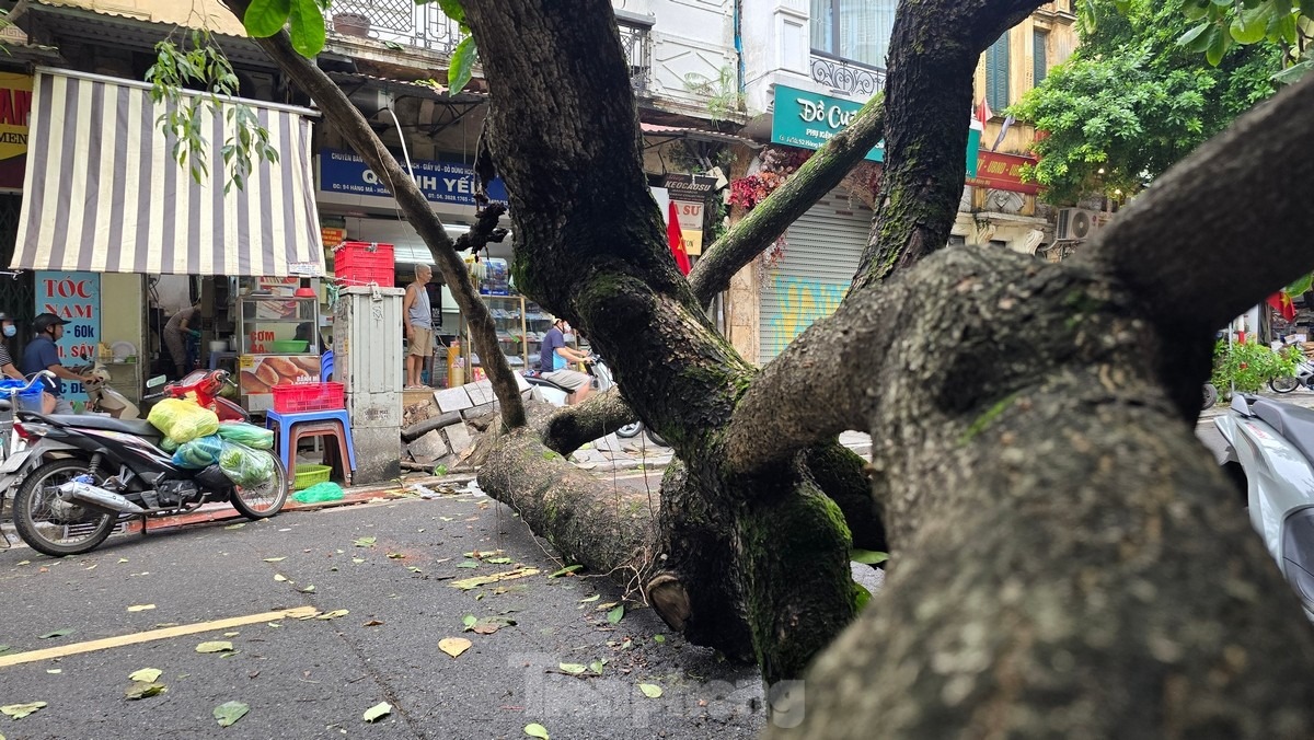 Tại Ô Quan Chưởng, hàng loạt cây xanh cũng đổ ngổn ngang. Tại đây, đơn vị chức năng phải thiết lập hàng rào chắn để cảnh báo các phương tiện không đi qua.