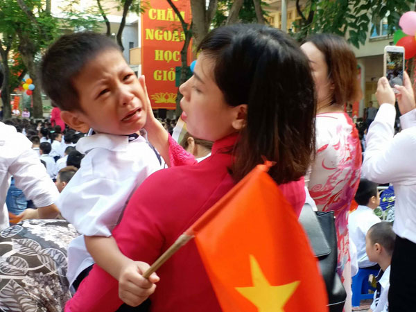Dù đã được làm quen trường lớp trước đó một tuần nhưng các bé vào lớp 1 không tránh khỏi cảm giác lạ lẫm khi dự lễ khai trường lần đầu tiên, có bé oà khóc nức nở.