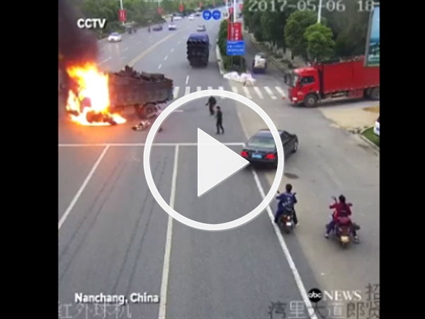 Clip cứu người đàn ông ở Trung Quốc khỏi chiếc xe tải đang bốc cháy khiến người xem rùng mình.