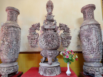 Bộ lư lọ chạm khắc đá mang tên "Tam bảo vĩnh hằng" được chủ nhân xưởng sản xuất đồ đá cho biết có một khách hàng người Trung Quốc trả giá 15 tỷ đồng nhưng ông không bán.