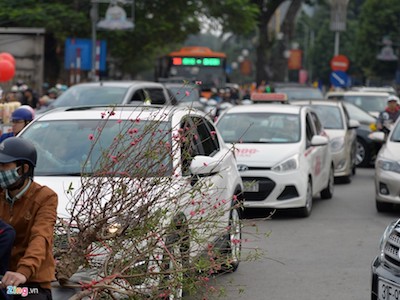 Chiều 30 Tết, nhiều khách đi ôtô lên chợ hoa Lạc Long Quân (Hà Nội) mua đào dừng đỗ bừa bãi dưới lòng đường gây ùn tắc giao thông. Có người thậm chí ngồi trên xe xem hoa.