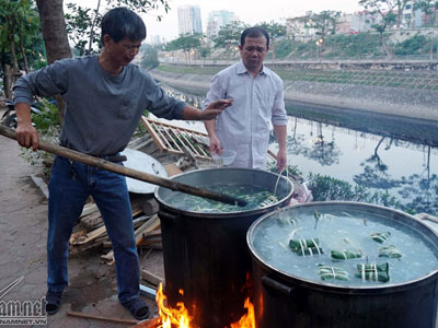 Người Hà Nội luộc bánh chưng bên sông, trên hè phố