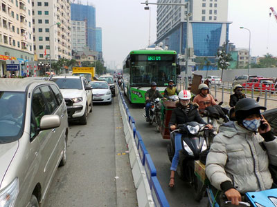 Dù lực lượng chức năng đã lắp dải phân cách cứng tại khu vực nhà chờ để lập lại trật tự giao thông, phục vụ tuyến buýt nhanh hoạt động hiệu quả nhất, nhưng rất nhiều phương tiện cả xe máy và ô tô vẫn vô tư “nhảy” vào làn đường dành riêng cho xe buýt nhanh.